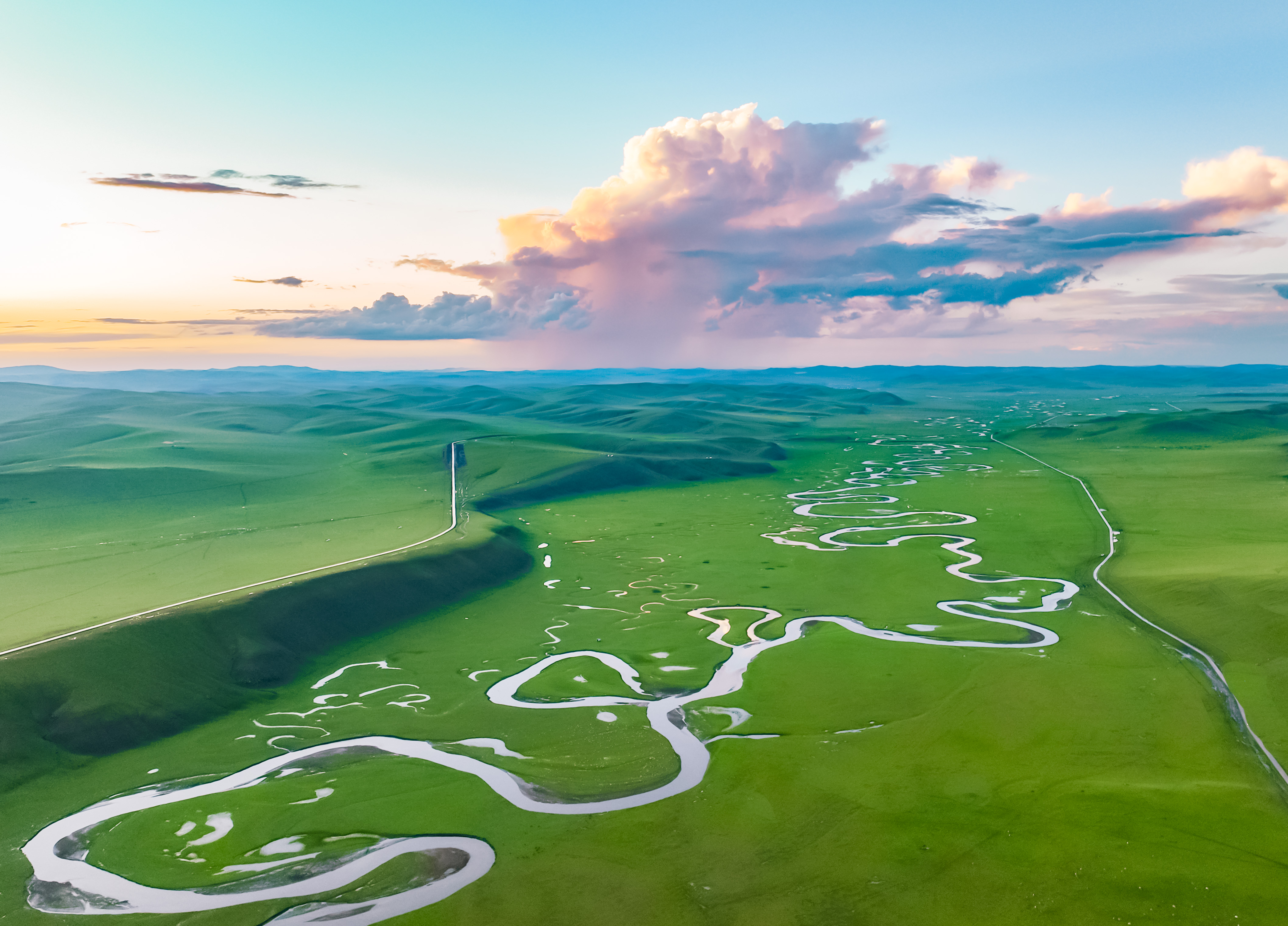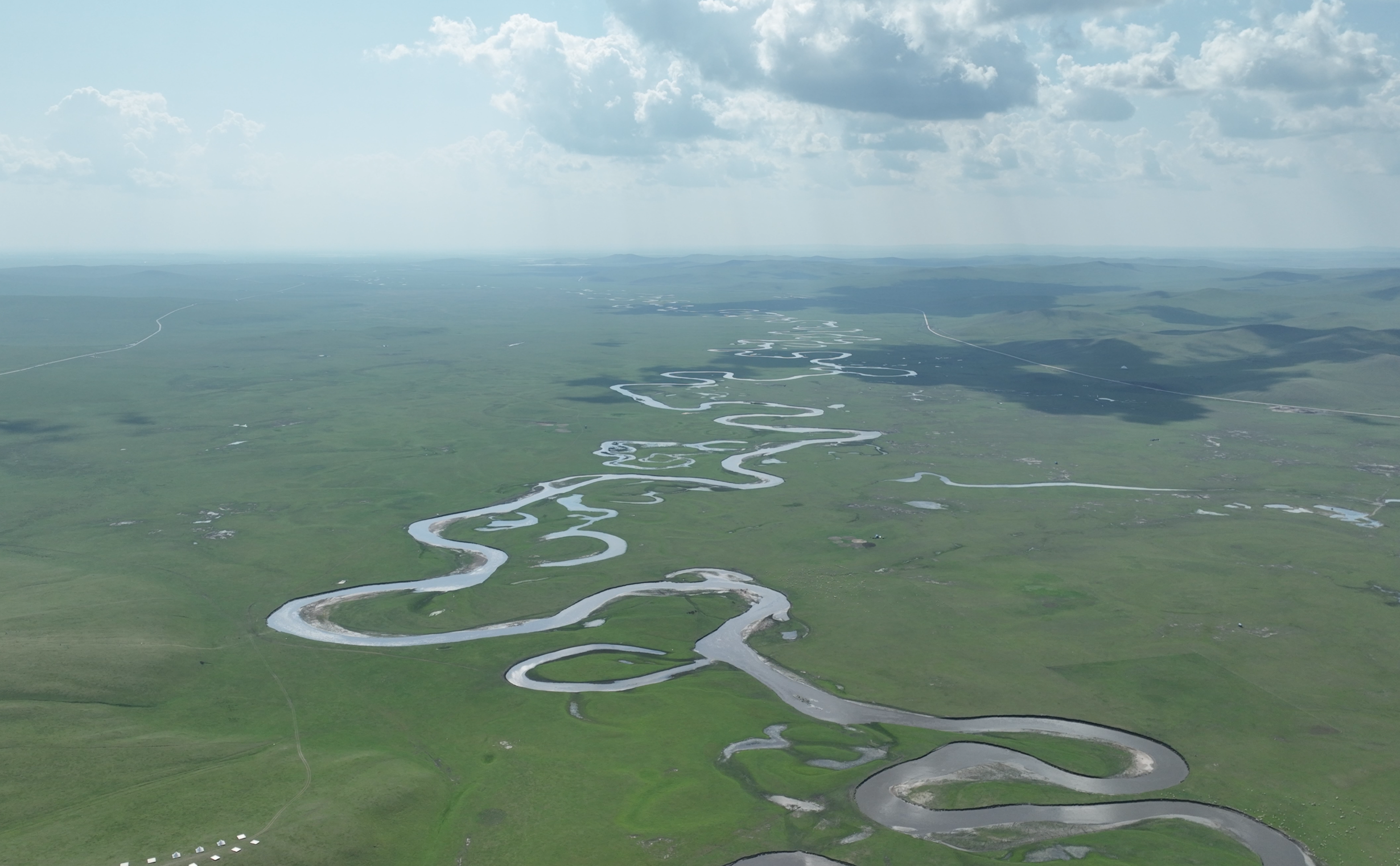 当你站在莫尔格勒河岸边,眼前的景象如同展开的一幅绝美画卷。一望无际的大草原像一块巨大的绿色绒毯,在微风中轻轻摇曳着。而那条莫尔格勒河,就像一条灵动的银色丝带,蜿蜒曲折地穿梭在这片广袤的草原之上,它那著名的“九曲十八弯”简直就是大自然用最细腻的笔触勾勒出的杰作,也因此常常被人赞誉为“天下第一曲水”。