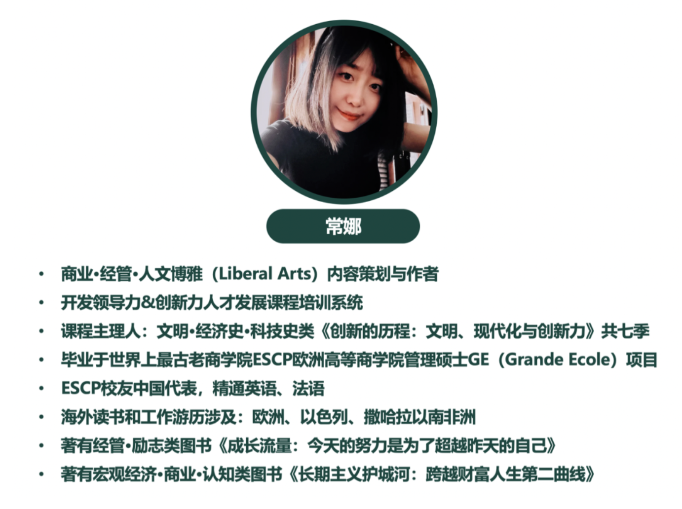 你好,我是常娜,感谢看见。《创新的历程》(第一季)是我在过去几年读书,与不同的教授、学者、创业者以及读书人学习交流过程中创作的通识启蒙课程。通识与人文博雅(liberal arts)教育并非培养具体的技能,而是以人本主义精神,关注每个人本身,培养丰富健全的人格、培养一个人获得并经营幸福的能力。