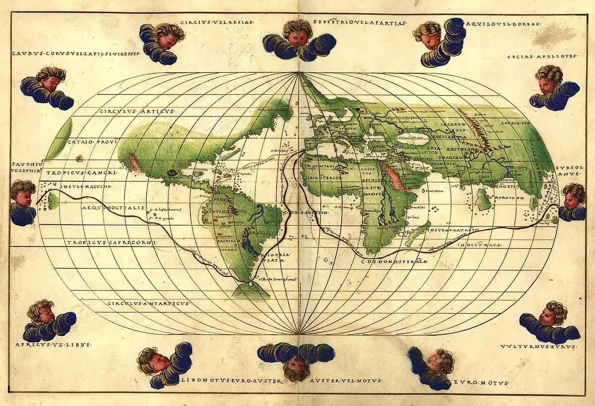 中央是一幅由刻有“海之彼岸,仍有疆域”字样的赫拉克勒斯之柱拱卫的世界地图。
