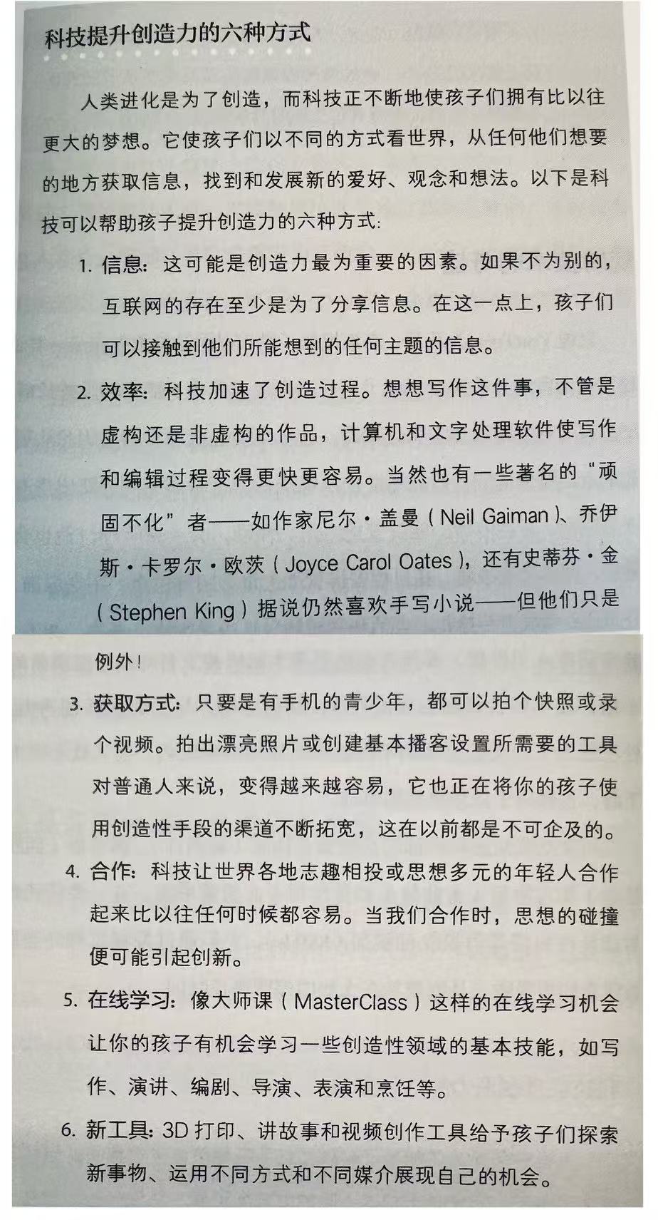 3、血清素:当我们积极创造的时候会产生的一种化学物质。科技的发展能从6个方面帮助孩子们提升创造力,所以,和这6个方面相关的APP,都是鼓励孩子使用的健康应用。(具体哪6个方面,下面有图~)