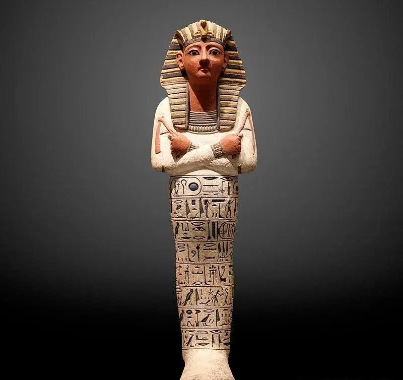 巫沙布提俑,又称沙布提、沙伯提,是古埃及的一种独特葬礼雕塑,ushabti在古埃及语中意为“答者”。这些小型雕像通常呈现俄赛里斯的形象,即裹着木乃伊的躯体,上面刻有死者的姓名,铭文摘自《亡灵书》第六章,意为“我回应你的召唤,全心全意地为你服务”。