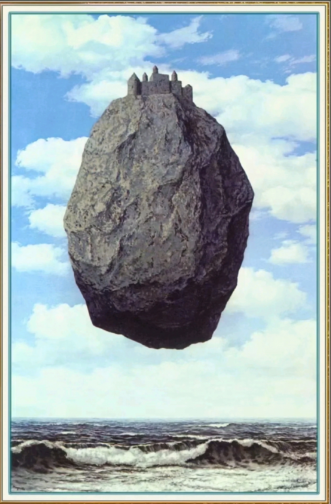 这块固执地抗拒坠落的巨石,最终成为人类精神状况的完美象征。它不提供任何答案,只是静静地、不可能地存在着,如同一个永远不会解开的谜题。而这或许正是马格利特留给我们的珍贵遗产——在一个人人急于解释、定义、归类的世界里,保留对不可解释之事物的敬畏与沉思。悬浮的城堡提醒我们,真正的思想开始于我们承认自己并不真正理解那些看似熟悉的事物之时。
