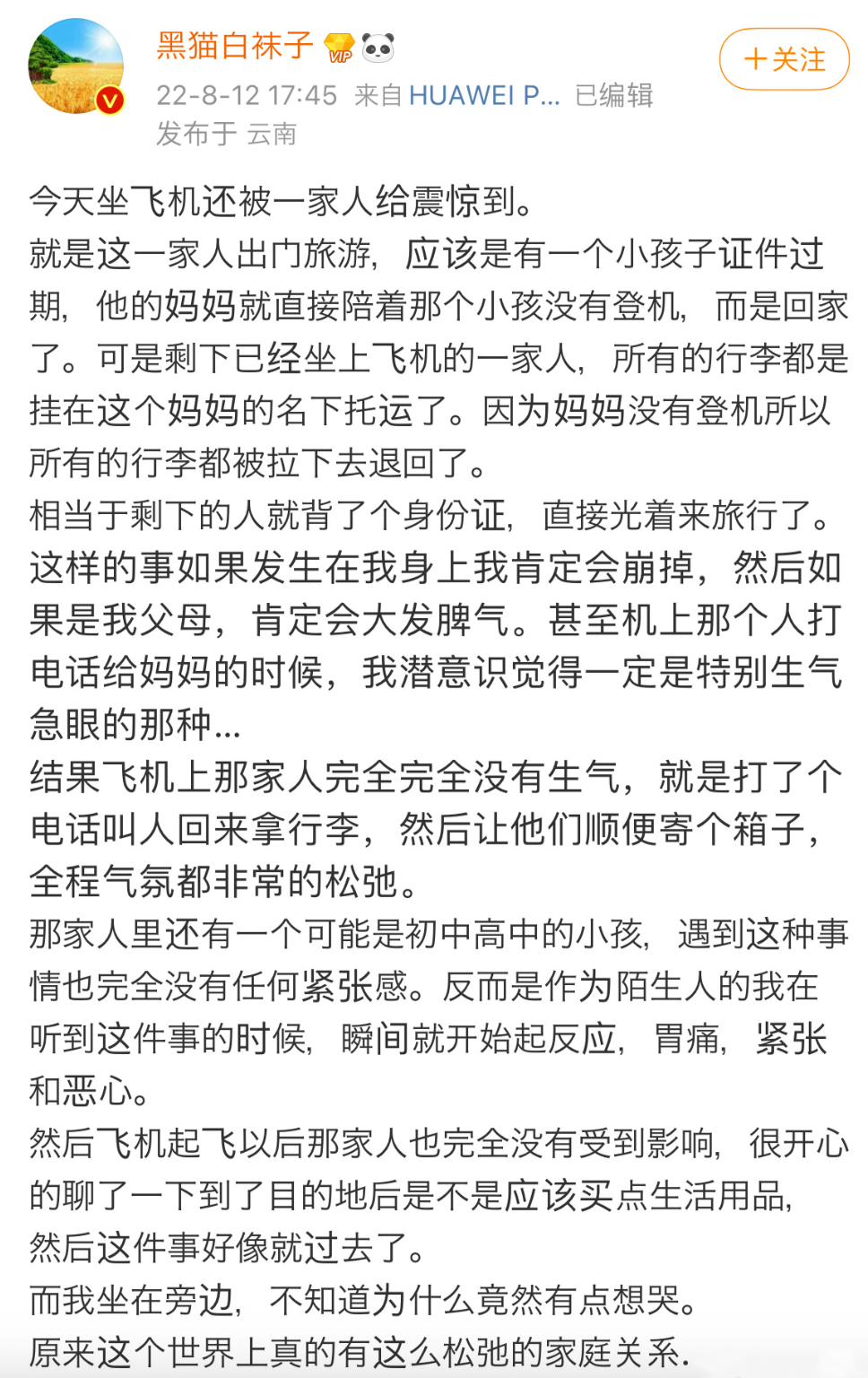 飞机上,博主遇到一家人,他们的行李托运出现状况,全部行李被退回。但他们没有出现同样情境下常见的生气、崩溃、互相指责,而是快速商量了一下就继续开心地旅行。博主感慨: “原来世界上真有这么松弛的家庭关系”。