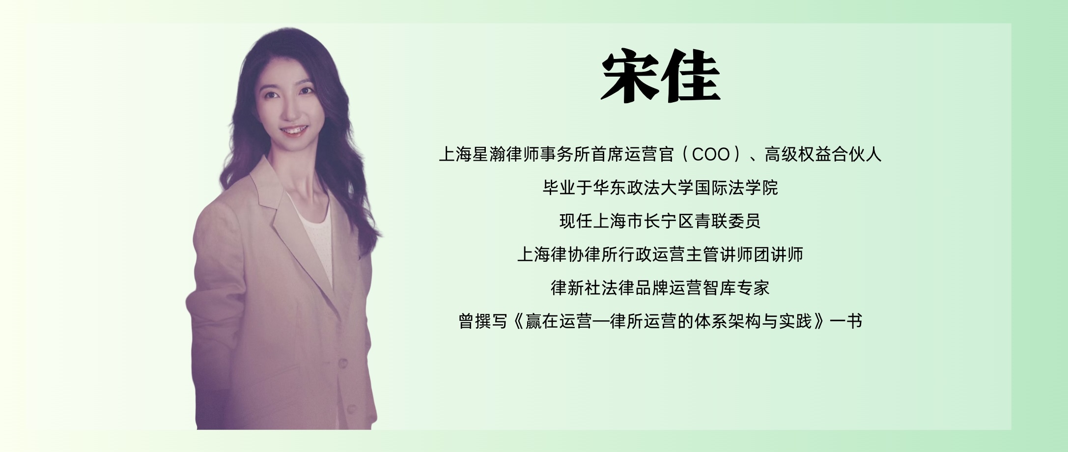 宋佳,上海星瀚律师事务所首席运营官、高级权益合伙人。毕业于华东政法大学国际法学院。现任上海市长宁区青联委员、上海律协律所行政运营主管讲师团讲师,并受聘为律新社法律品牌运营智库专家。宋佳⽼师的学术著作《赢在运营―律所运营的体系架构与实践》已由法律出版社出版。
