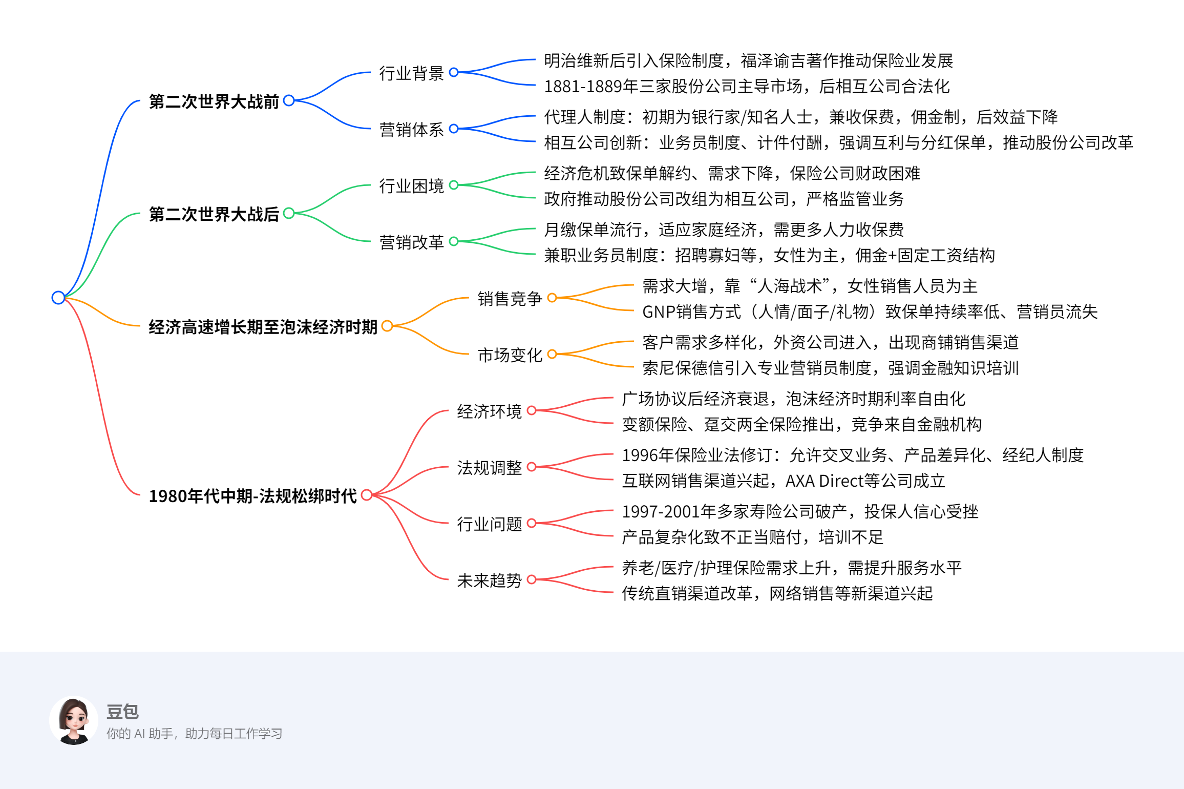 - 日本保险公司仿照西方模式经营,但人寿保险营销制度具本土特点。1881 年明治人寿成立,至 1889 年三家股份公司主导市场,1899 年法律禁止相互组织,1900 年又重新合法化,1902 年和 1904 年第一人寿和千代田人寿两家相互保险公司成立,后成为前五大公司,不同组织形式影响营销体系发展。