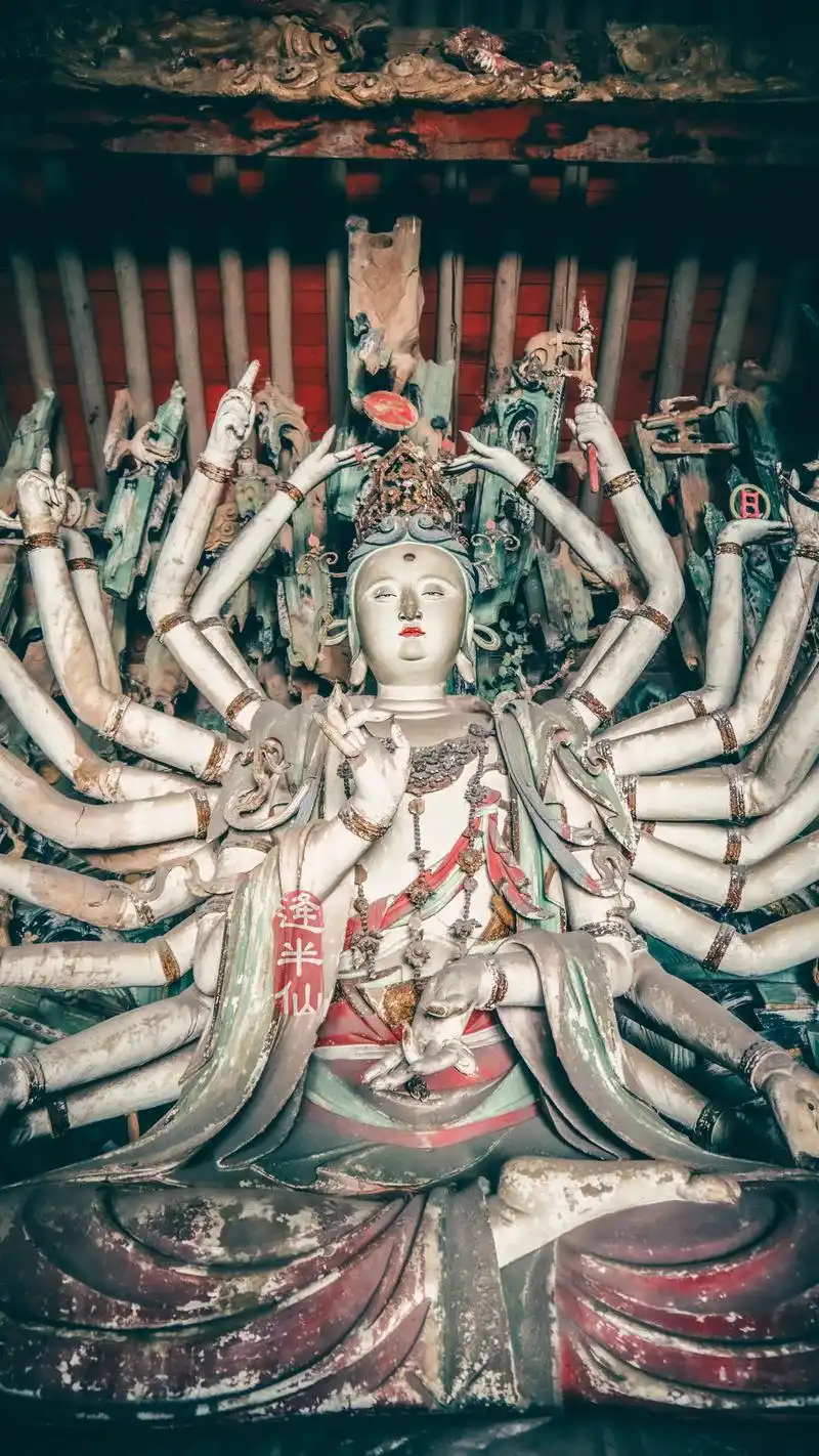 "双林寺韦陀目如电,小西天梵宫坠云巅。福胜观音踏海去,留得舌底莲花翻。问君塑像何所语?泥胎道破禅非禅——"