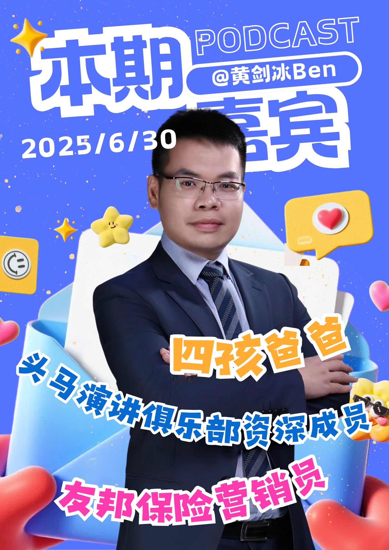今天我们邀请到一位经历跨界转型、在不同领域都活出独特节奏的嘉宾 —— 黄剑冰(Ben Huang)。他曾是行走亚非欧大陆的 “外贸老兵”,十年间用脚步丈量世界;如今是深耕保险行业的寿险顾问,在与人的深度连接中洞察人性;更是头马舞台上的中英讲者,从 “角落旁观者” 蜕变为 “舞台发光体”。他如何在性格内敛与职业挑战间找到平衡?又是什么让他在跨行业转型中始终保持前行的力量?
