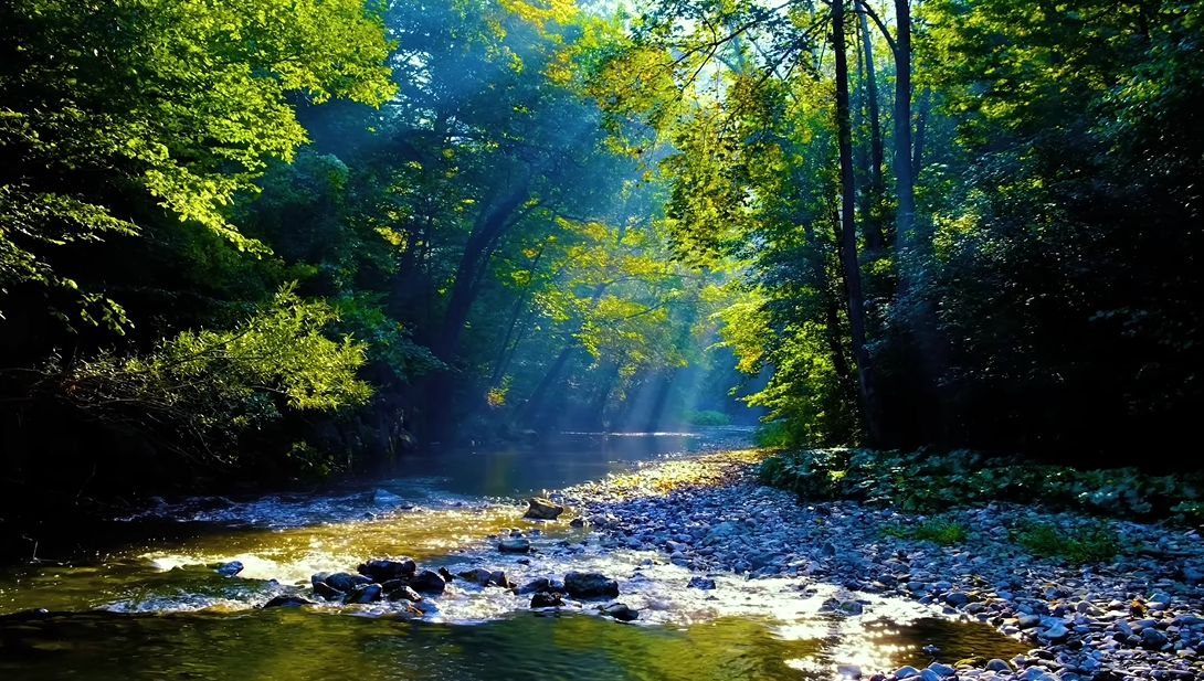 阳光洒落在森林间,潺潺溪水缓缓流淌着,
