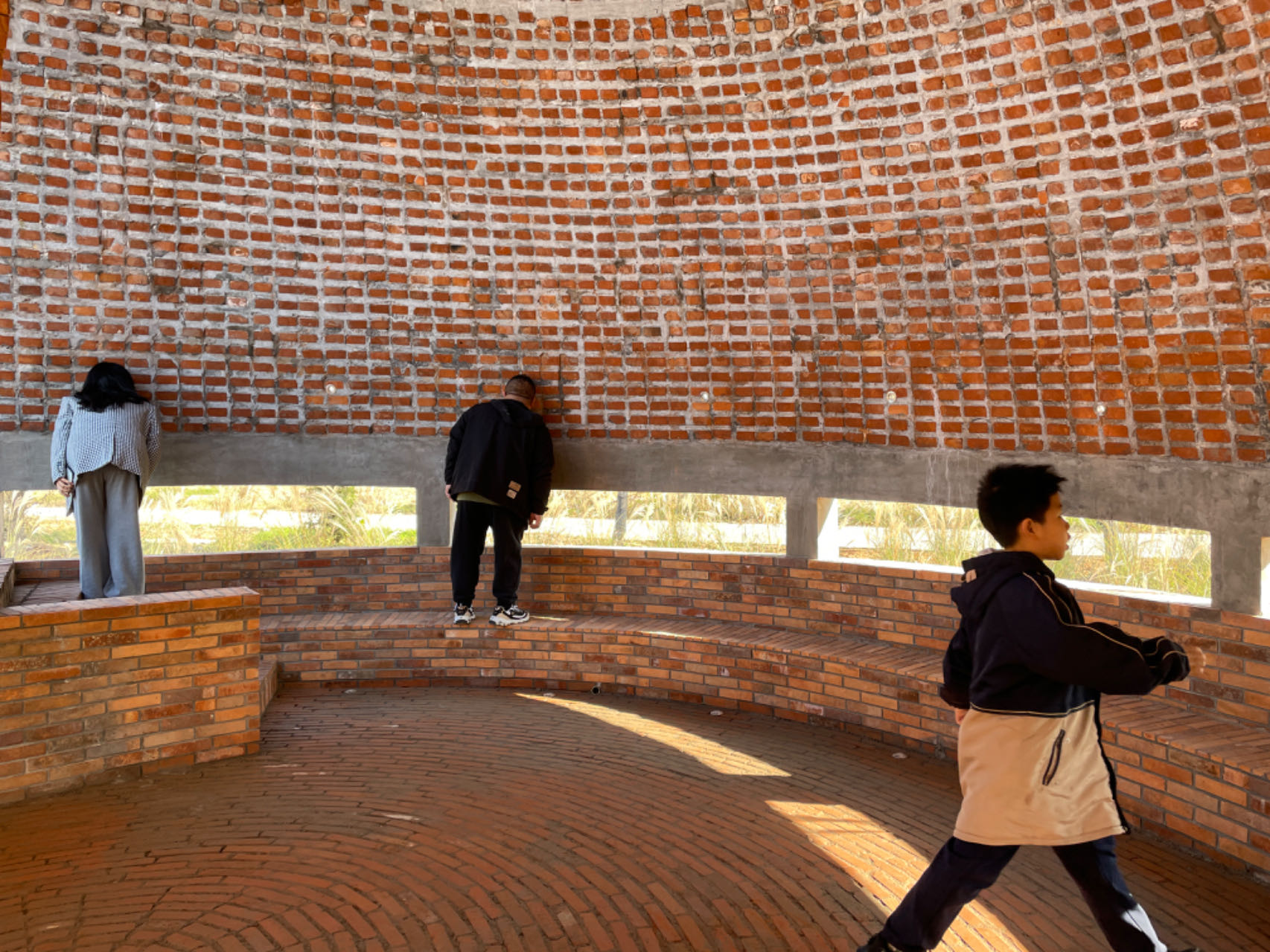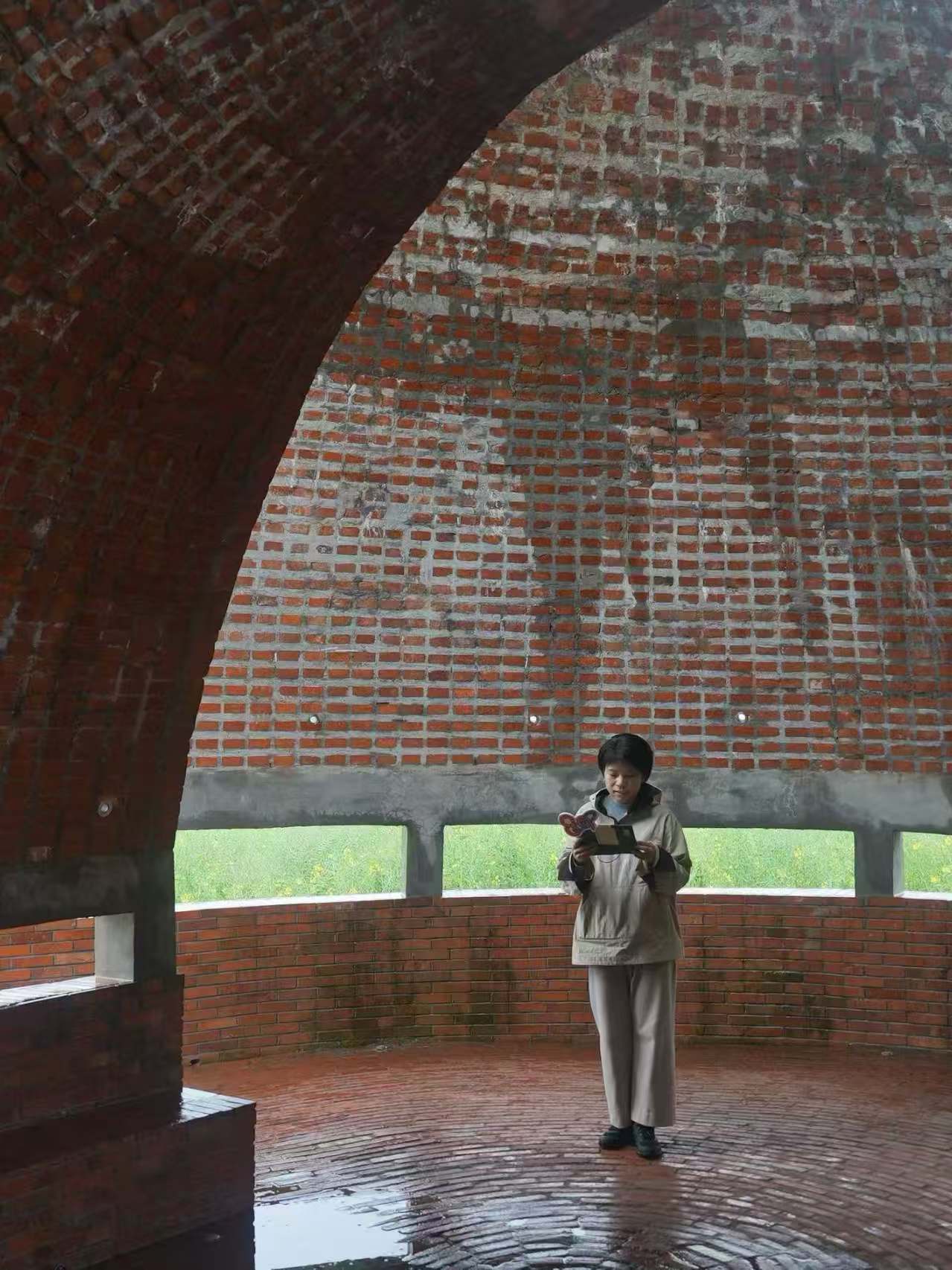 00:10:49 陈昊和胡琛琛分享建筑设计灵感来源——阳光和红土;建筑特色——红色砖体、半圆形壳体、猫眼孔洞;以及设计理念——带来庇护感;