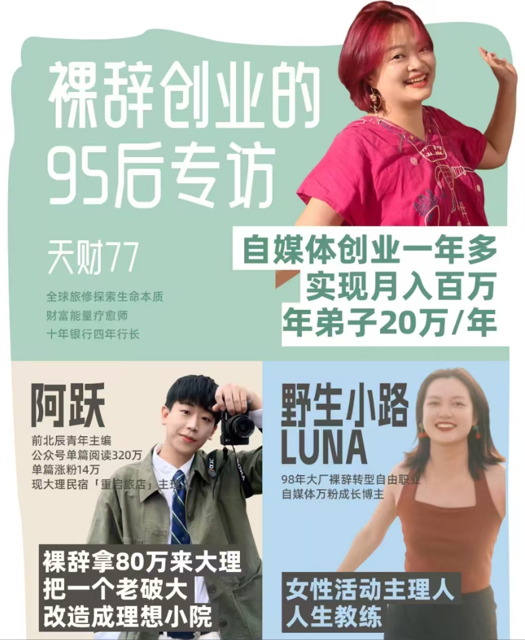 本期是《那些裸辞创业的95后》系列访谈的第一期,对谈辞职创业的小路和阿跃,分享勇气、智慧、全新的生活方式。希望可以通过深度访谈,去洞见事物背后折射的社会议题和真相。欢迎大家添加我的微信,加入访谈话题群——“充满生命力的创造”,提出任何你想探讨的问题、困惑(职场、旅居、创业、自由职业、内在成长、天赋探索......),也欢迎大家推荐适合参与访谈的嘉宾。
