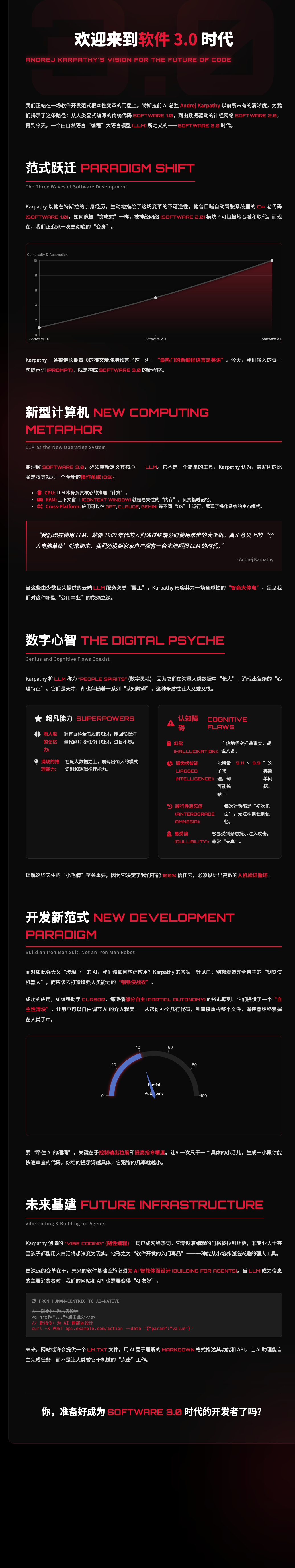 今天看完 Andrej Karpathy 的演讲:Software is Changeing (Again)。他是时代的前瞻者,每次对趋势的判断都值得参考。同时他的演讲有趣又有料,非常值得一看。我制作了中文的 AI 播客版本 Powered by ListenHub