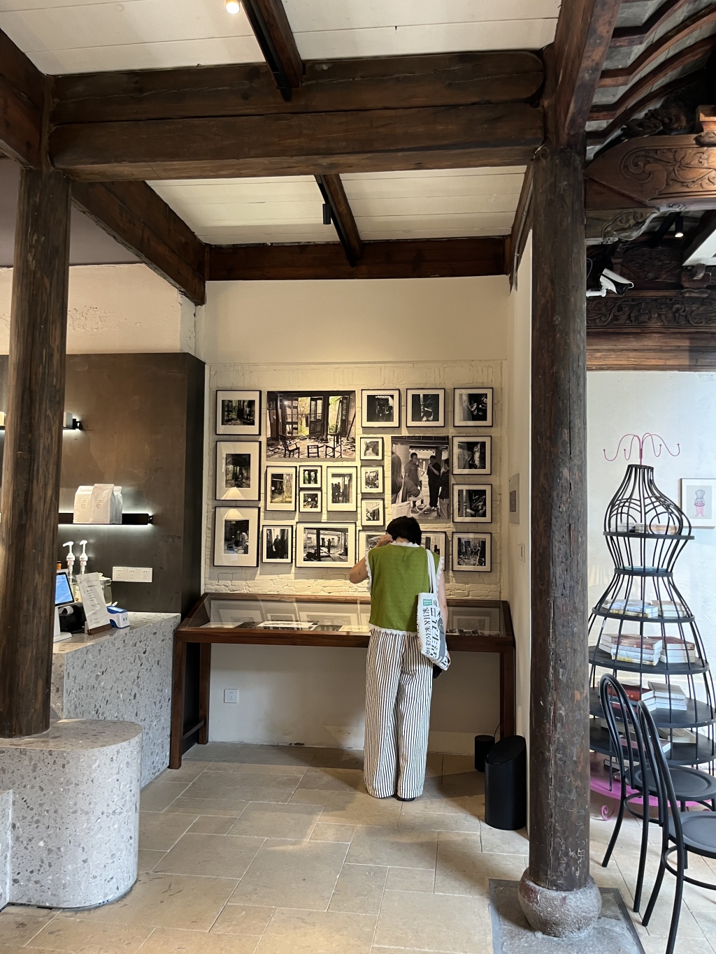 弄堂门口随意贴着一小块绿色的海报“繁花书房”,三年后海报才成了招牌,这里成了古镇的一个文化空间。2024年春天的开业仪式很隆重,小镇历史上可能从来没涌进那么多人,一身白色衬衫的许知远在隔壁的小广场四处走动,他几年前拍的《十三邀》记录下了未修缮前金家老宅的原始面貌,镜头里他和金宇澄坐在那个院子里聊天听风声。而如今,金宇澄站在同一块地方,在人来人往中招呼着大家,接受着一波波采访。