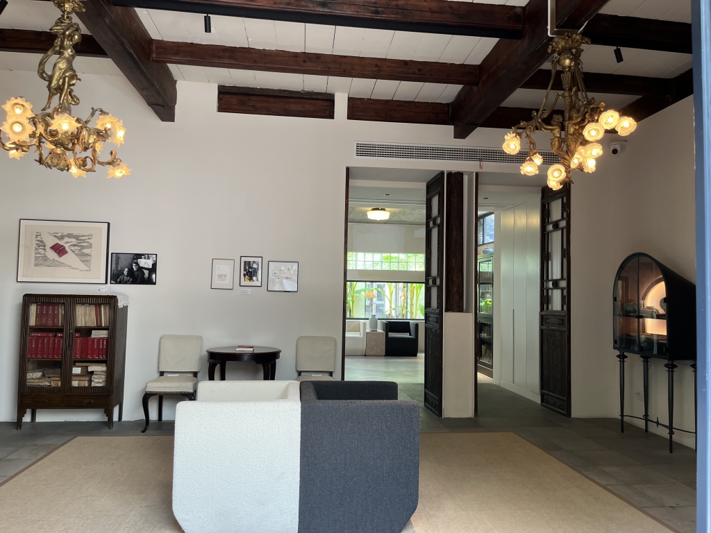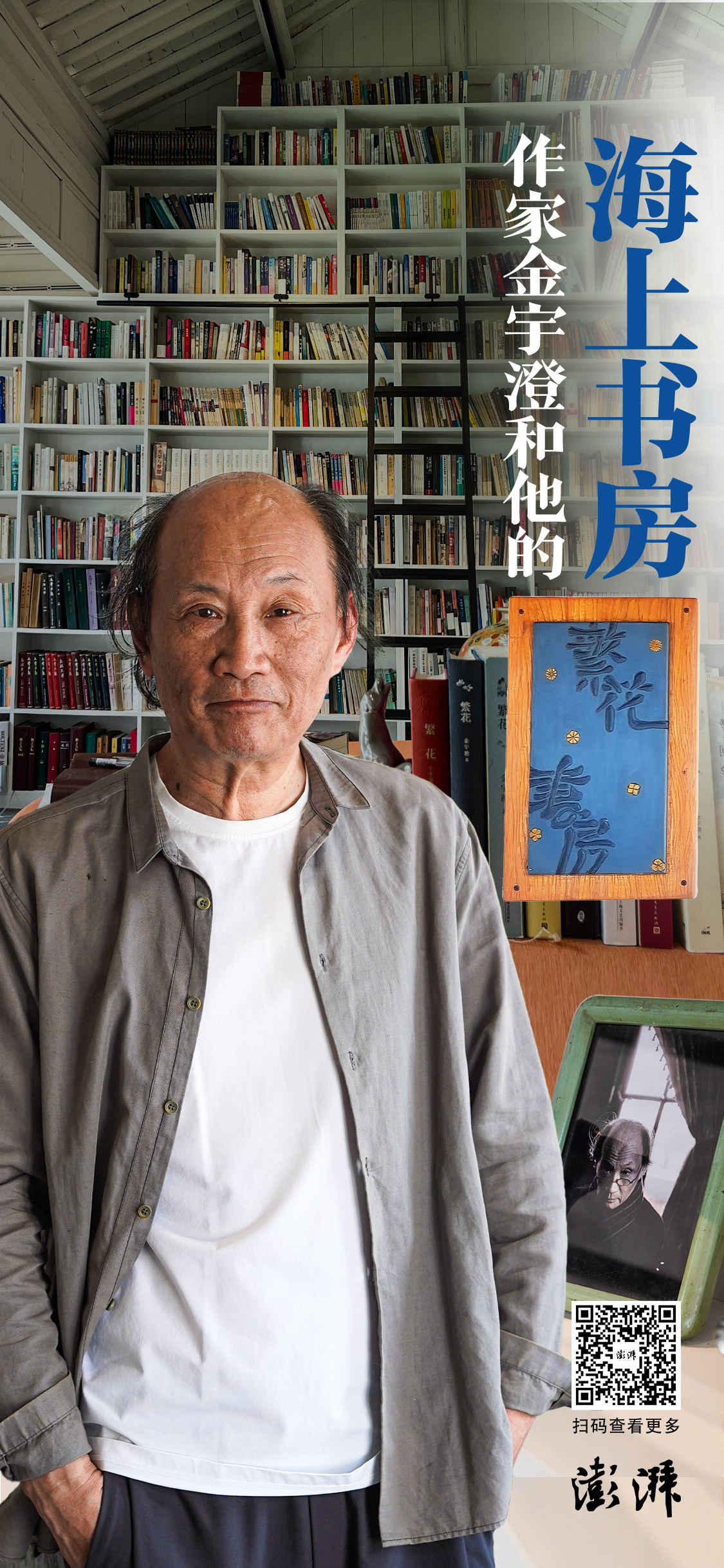 “繁花书房”里真的有一间书房,满墙的书架里摆满金宇澄从上海家中搬来的各种书。他并不是一个对藏书有执念的人,大多是这些年的新书,但间或夹杂着四五十年前的旧版稀有书,就这么放着等读者来翻阅。