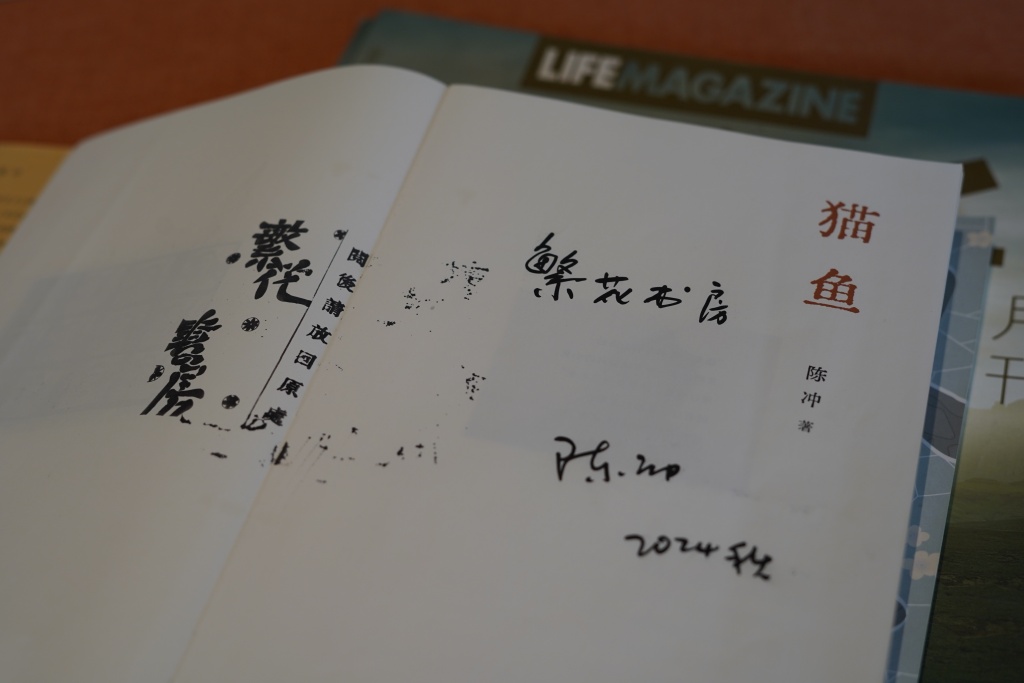 金宇澄最得意的是这个空间里墙上的画框,天花板上下坠的吊灯等林林总总,都是他这些年在各处老货店淘来的,而且价值不菲。在这其中,金宇澄特别珍视一位陌生读者的手写信和她送的两本小书,他特地装在画框里。那是去年繁花书房开业当天,一位读者从常熟来到现场,在当时吵闹的现场,就在书房中央的圆桌上手写了一封信,后来连带着自己带来的两本小书交给了金宇澄。