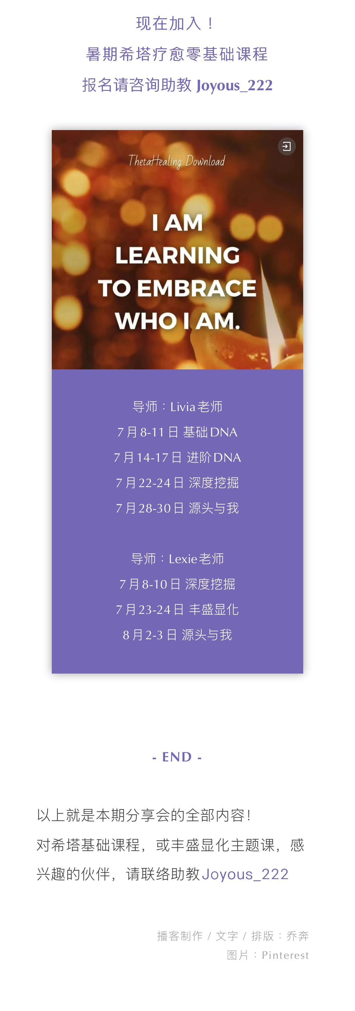 爱的光波学员猫猫,向我们讲述她过去一个半月,成为疗愈师的飞跃~02:54 - 06:00 - 09:26 - 12:5016:30 - 20:00 - 22:2825:4029:25 - 31:30 - 33:00「爱的光波」暑期课程介绍|详情请咨询助教:Joyous_222