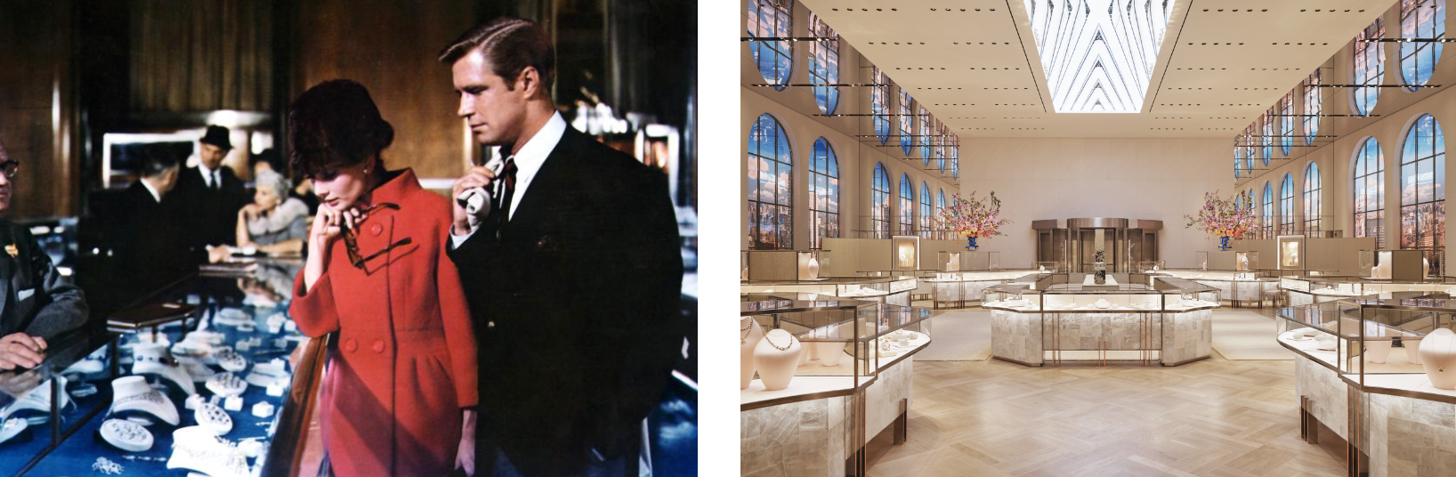 左:《蒂凡尼的早餐》中纽约店面的场景,1961 年