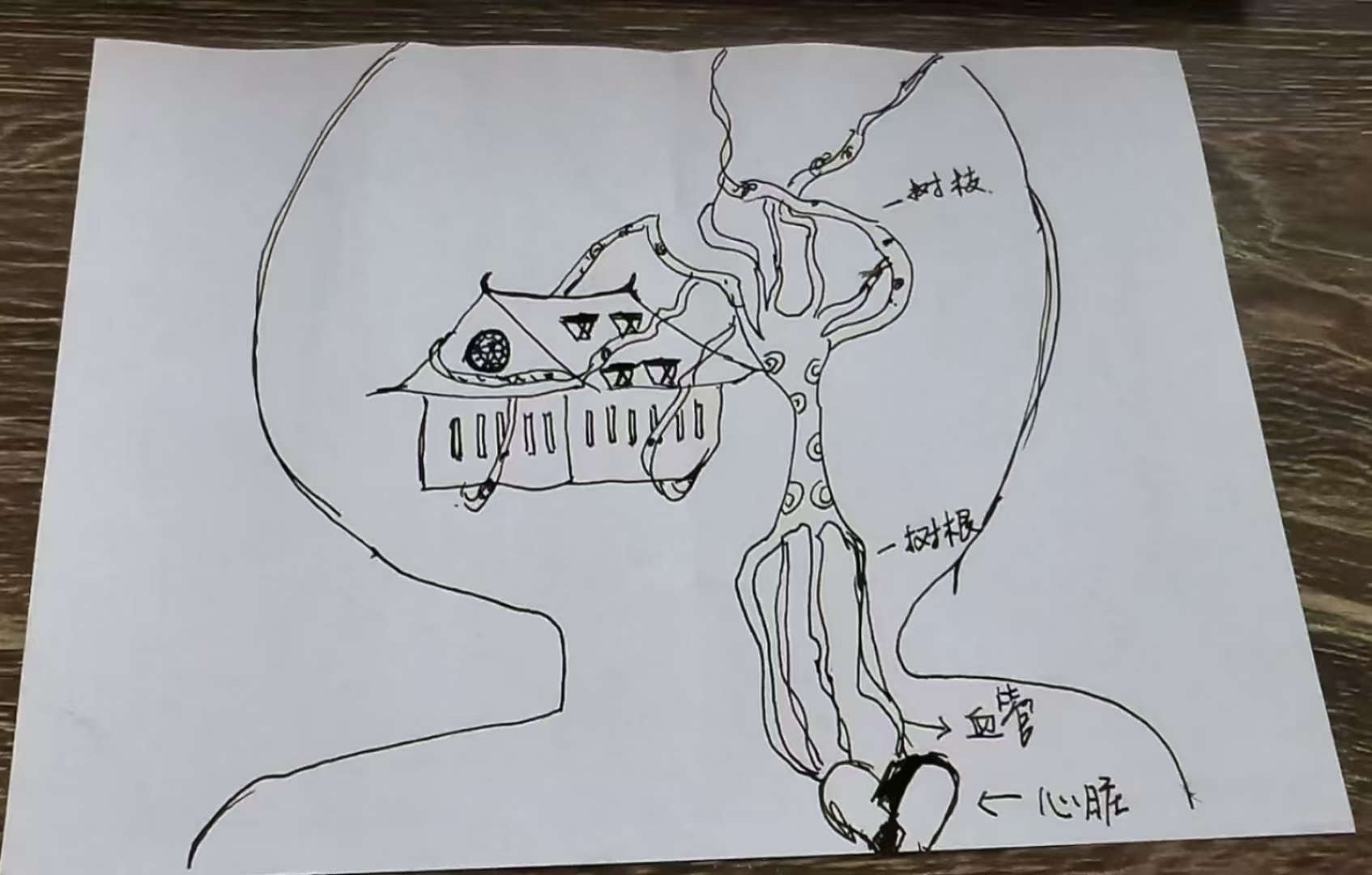 灯灯:抽象巨人的心脏上长出树根,树枝将房子紧紧缠绕