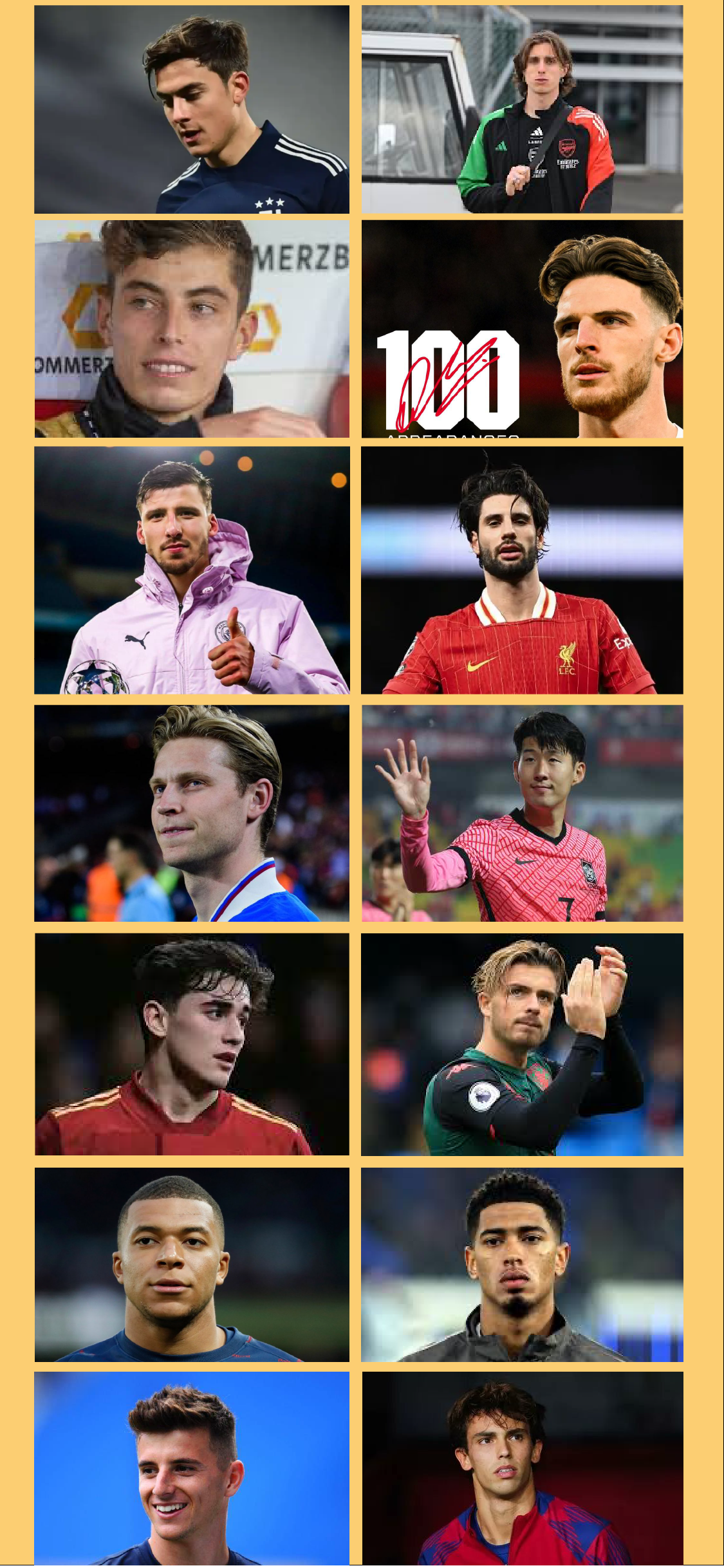 迪巴拉、卡拉菲奥里、哈弗茨、赖斯、鲁本·迪亚斯、索伯斯洛伊、德容、加维、格拉利什、贝林厄姆、孙兴慜、菲利克斯、姆巴佩、芒特。