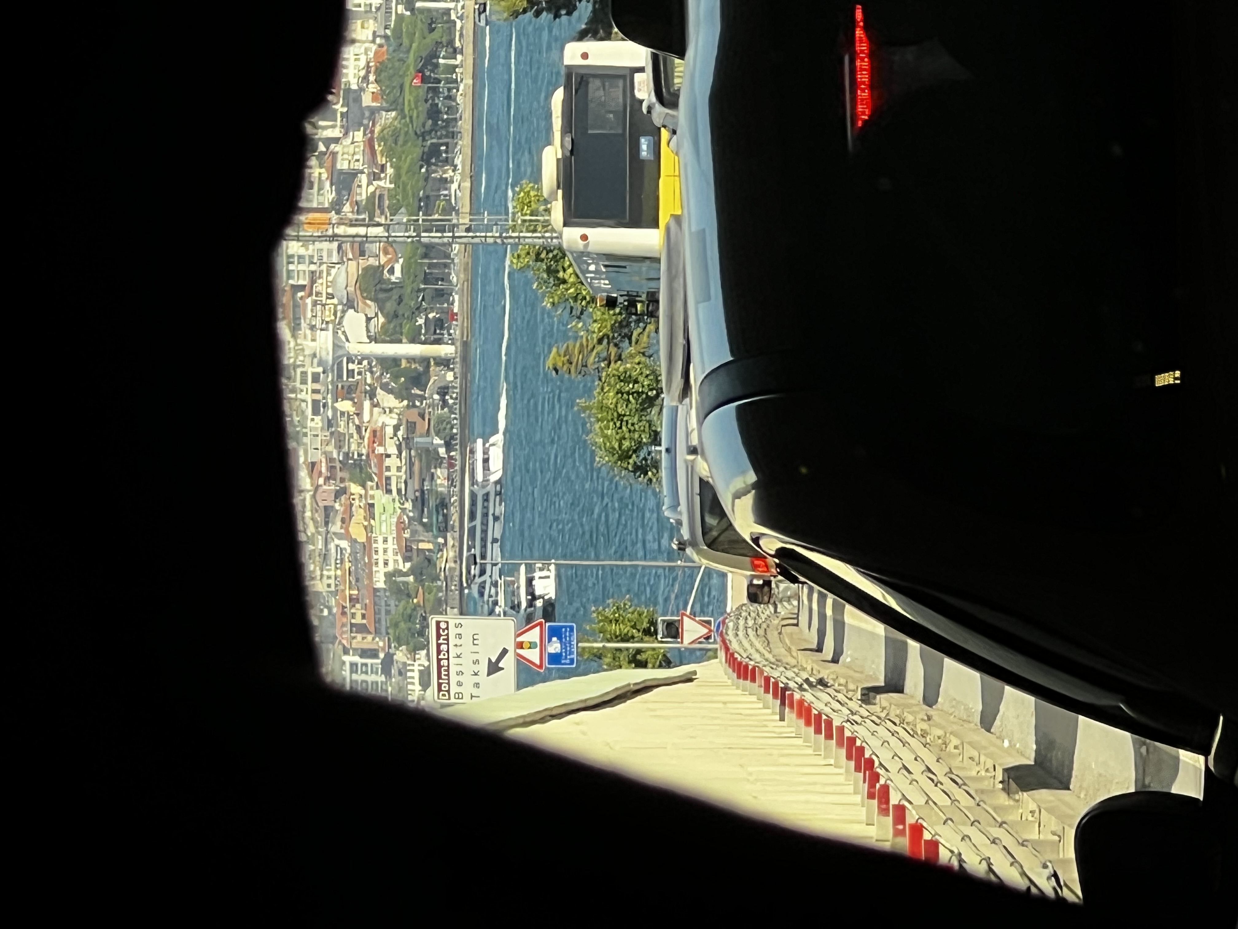 *从城际隧道中窥见远处漂浮在道路尽头的、蔚蓝的金角湾。