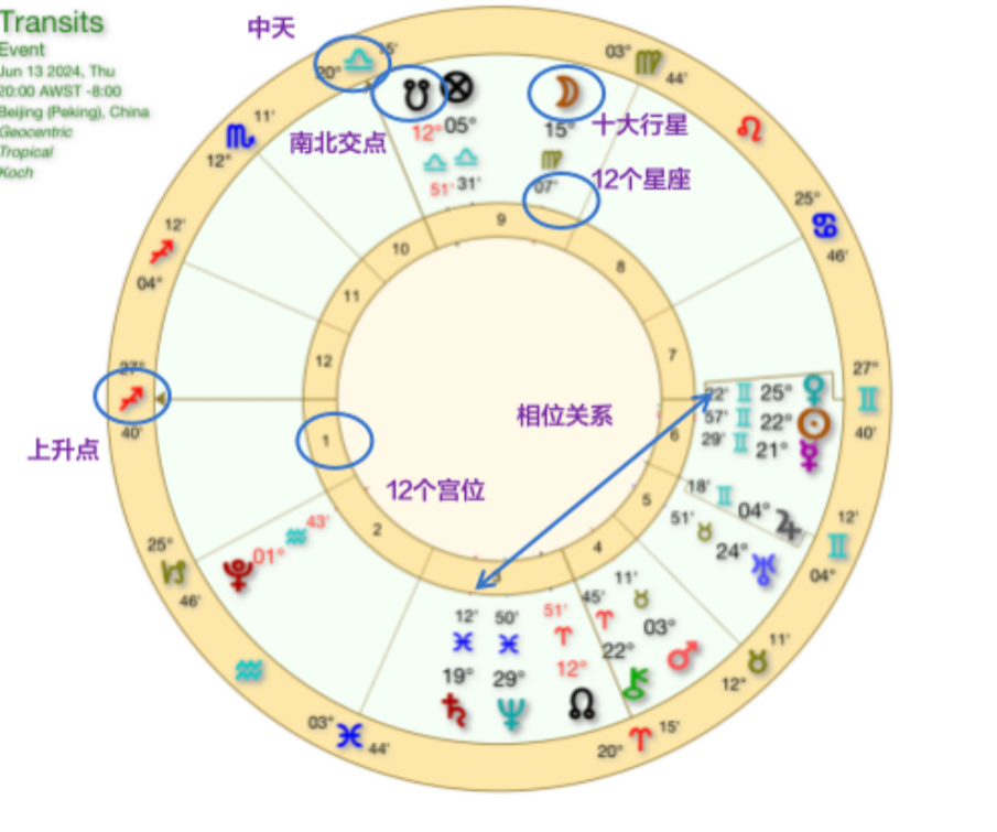 这期节目就帮大家从小白友好的视角,打开星盘,解释星盘的结构和各个基本要素,12个宫位、10个行星、12个星座、四轴(上升、下降、中天、下中天)。同时举例说明,如何解读:星座+行星+宫位的组合造句。