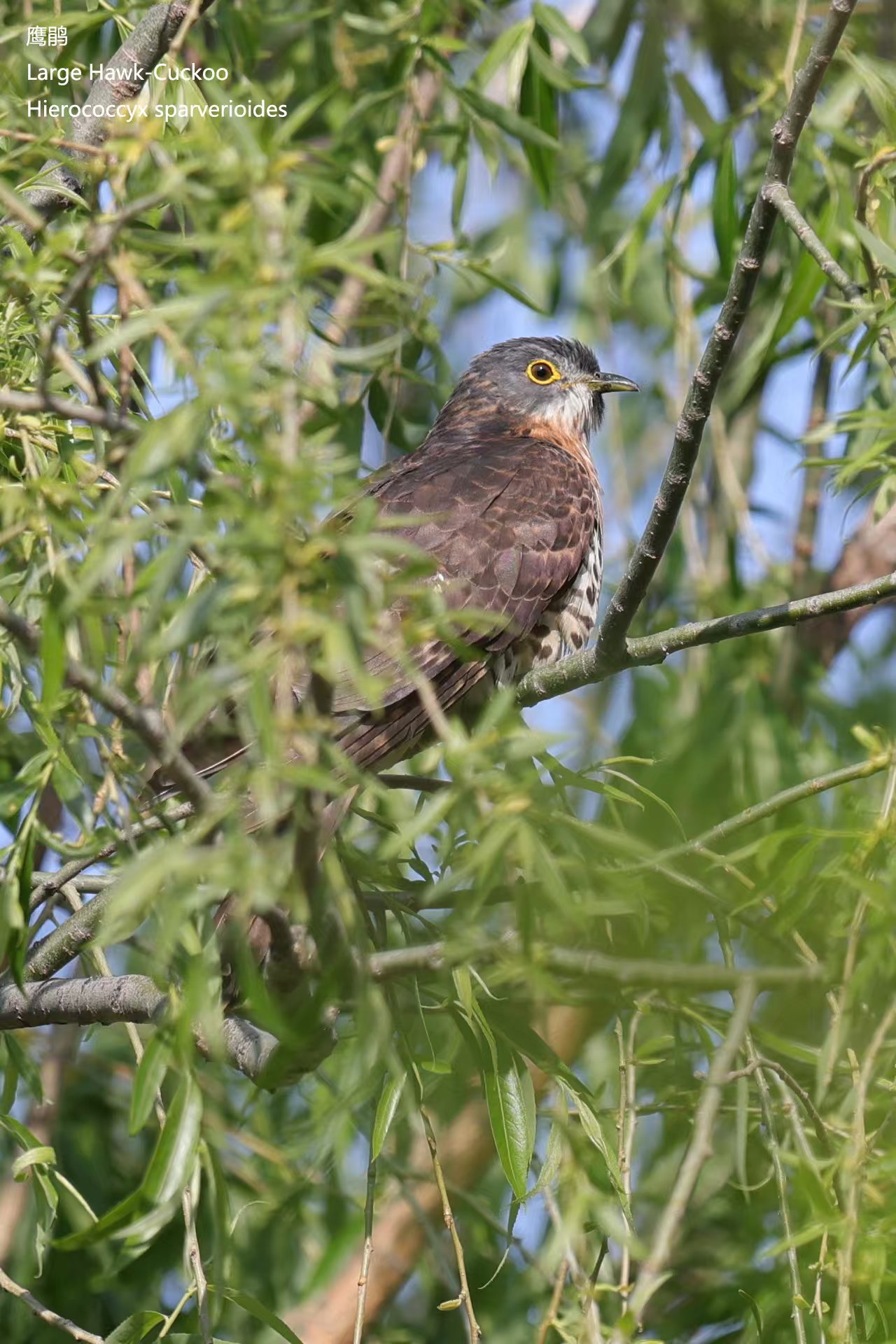 大鹰(yīng)鹃(juān) (英文名:Large Hawk-Cuckoo,学名:Hierococcyx sparverioides),是鹃形目杜鹃科鹰鹃属的鸟类。又称子规、鹰头杜鹃、贵贵阳、米贵阳、阳雀。其尾部次端斑呈棕红色,尾端白色,胸棕色并带有白色及灰色斑纹,腹部具白色及褐色横斑染以棕色。广泛分布于喜马拉雅山脉西部至中国东部和亚洲东南部,包括印度、东南亚、印度尼西亚、台湾岛以及中国大陆的辽宁、河北、山东、河南、秦岭至四川、西藏、云南、海南等地。