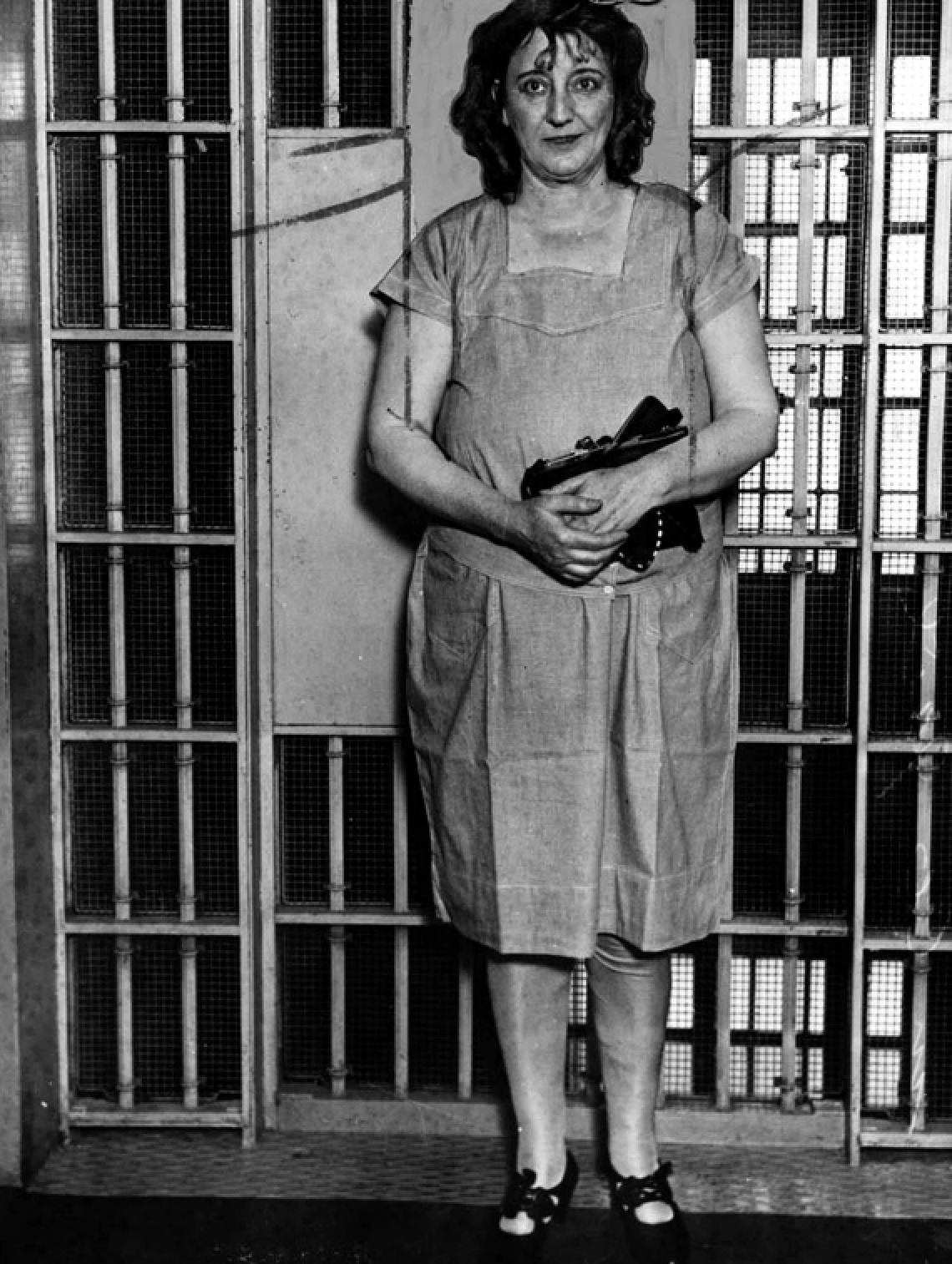 Dolly Oesterreich站在监狱牢门前的照片。