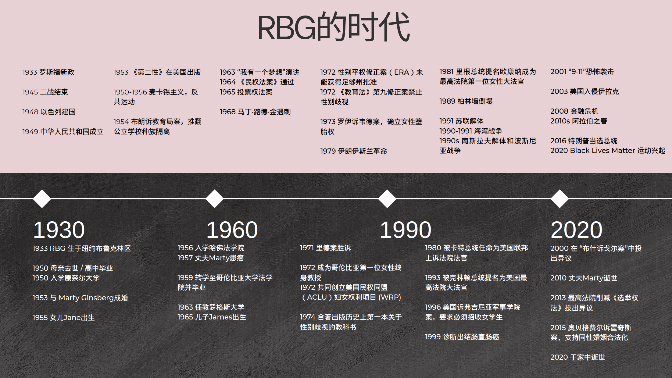 4:40 Ruth Bader Ginsburg (RBG) 本人的人生节点和她所生活的时代的历史节点的交叉介绍