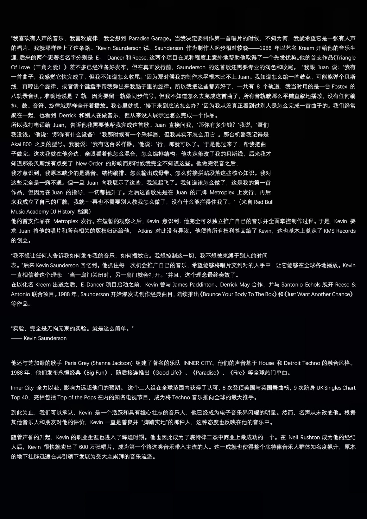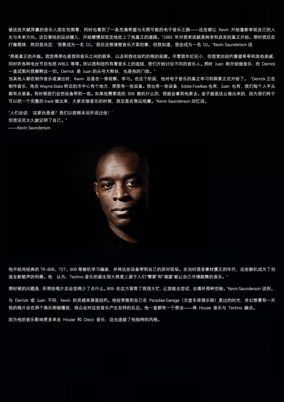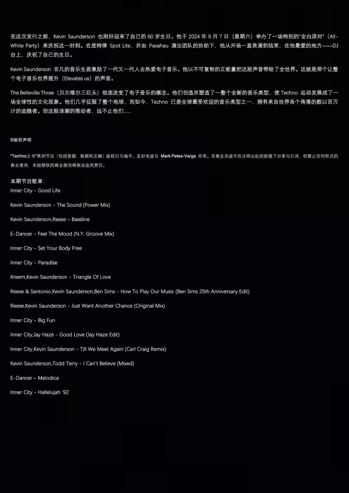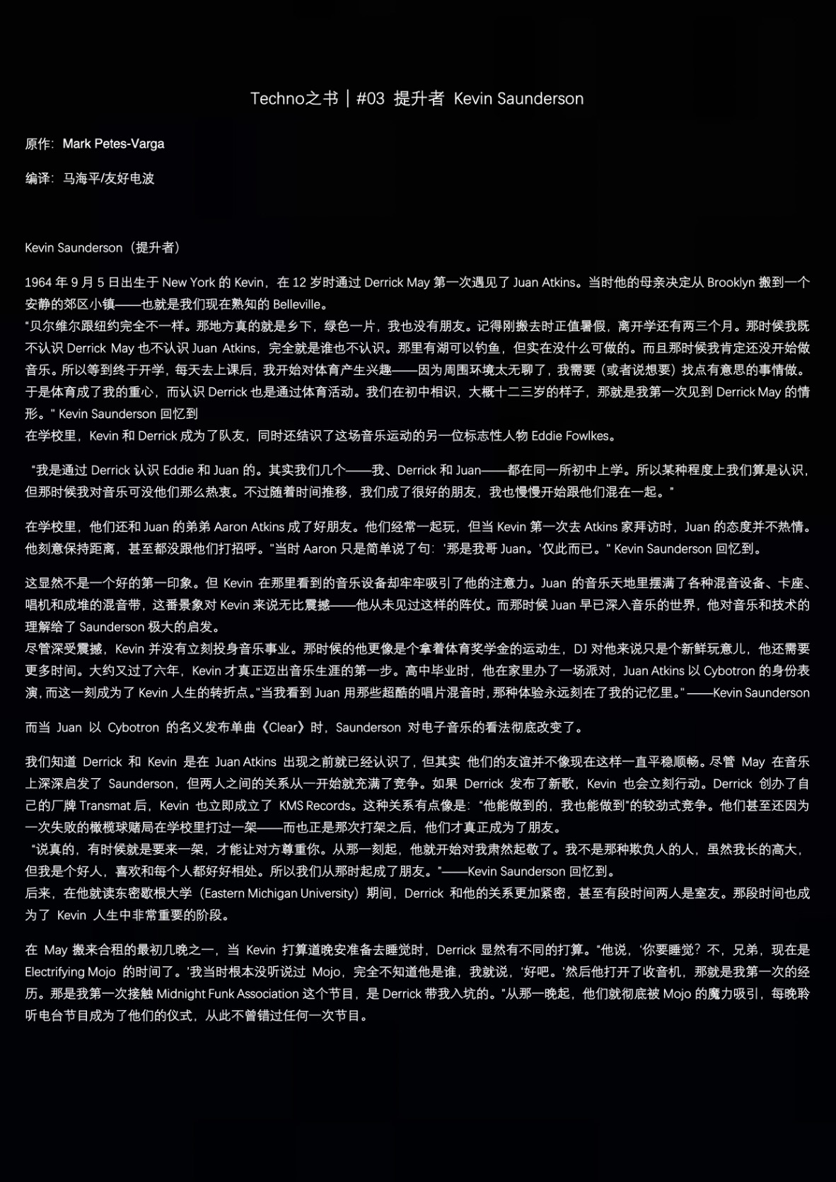 本期节目介绍Techno创世神话的最后一位——Kevin Saunderson,他被誉为“提升者(Elevator)”。作为“底特律三杰”之一,凭借《Good Life》和《Big Fun》等经典作品的巨大商业成功,带动了Techno从底特律走向全球,成为一种长久的文化现象。