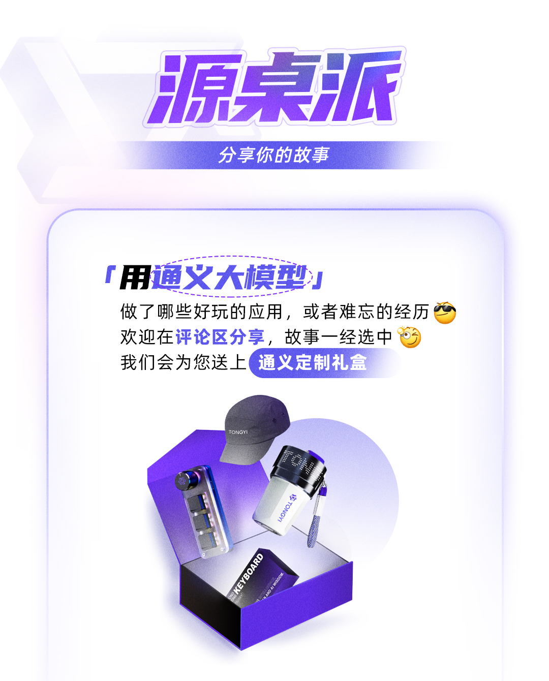 如果您用通义大模型开发过应用,欢迎留言分享,一经选中即可获得「通义定制礼盒」。