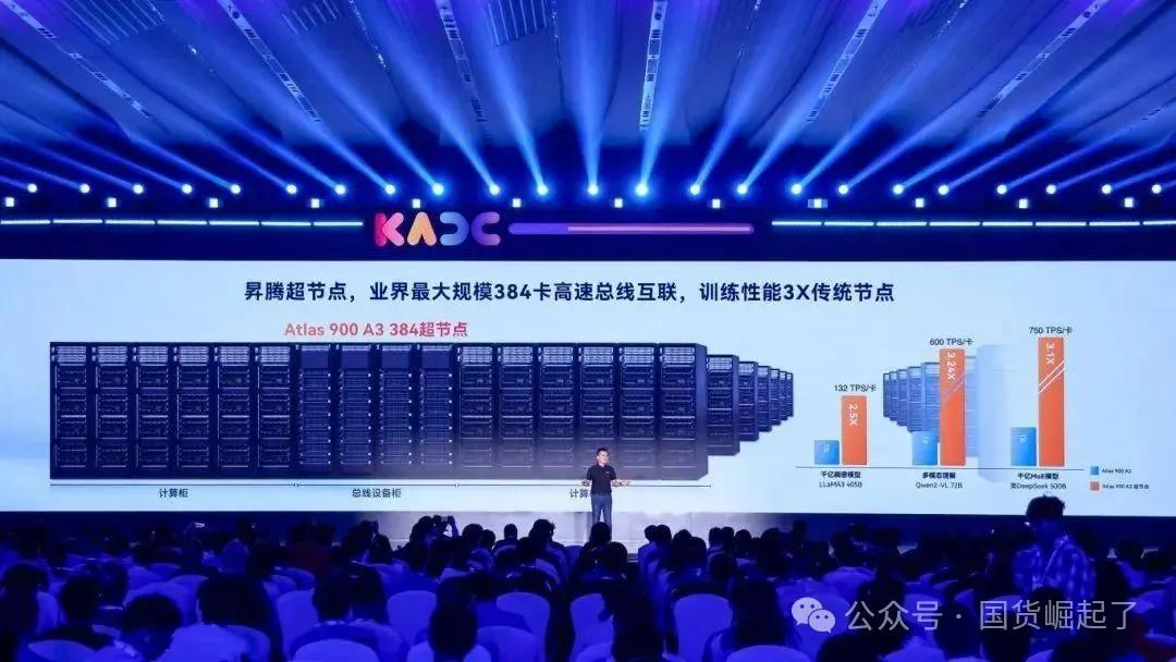 更绝的是它的 “扩展性”。这台超节点可不是孤军奋战,它能像搭积木一样扩展成包含数万卡的超级集群。打个比方,现在的昇腾 384 是 “营级战斗力”,扩展后直接升级成 “军团级”,不管是训练千亿参数的大模型,还是支撑亿级用户的 AI 服务,都能轻松拿捏。