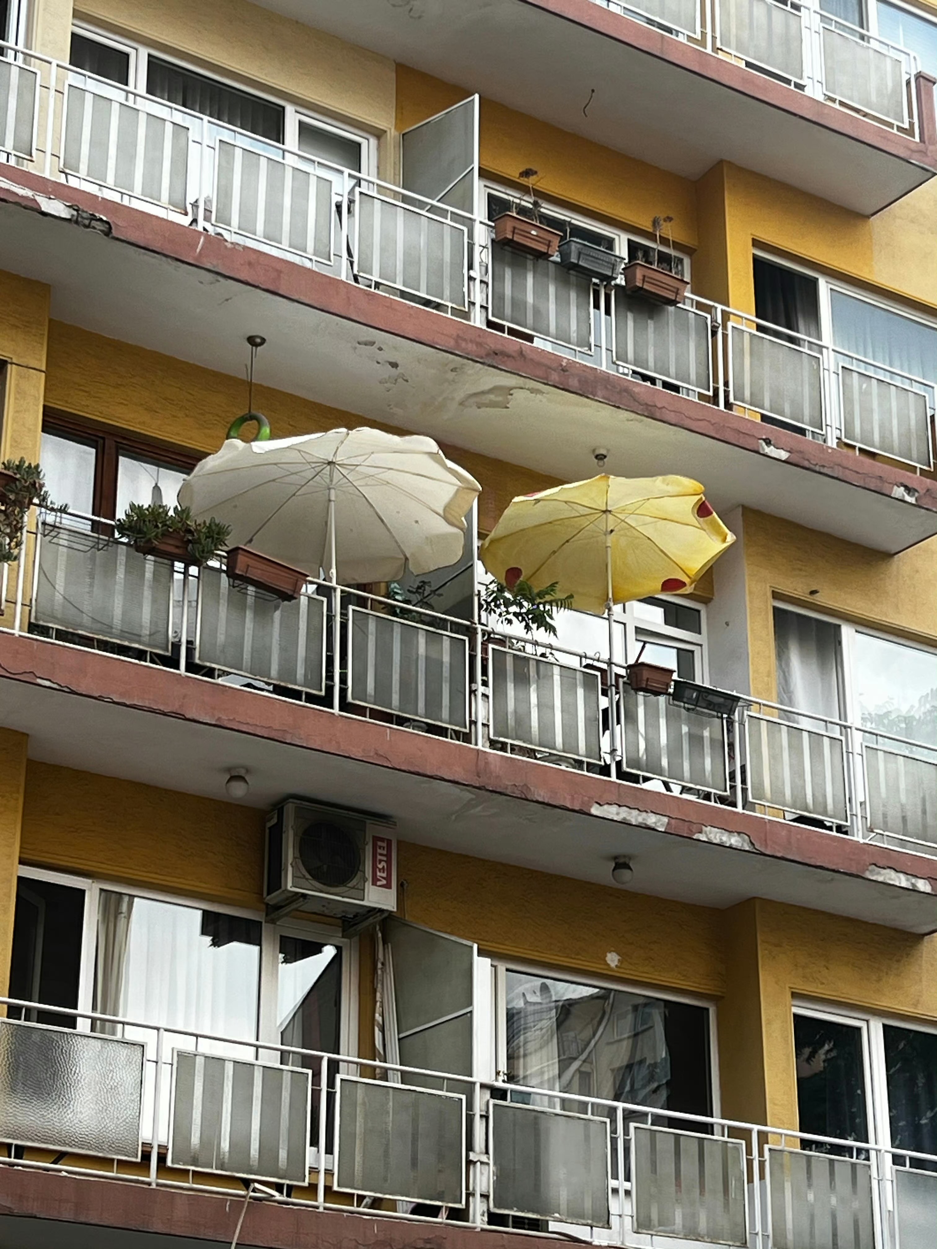 *黄色的老旧楼房阳台上,挨着的两家人用了两把款式类似、花色不同的遮阳伞。我抬头的时候恰巧看到两把伞挨在一块儿迎风翻飞,突然感到夏天的气息扑面而来
