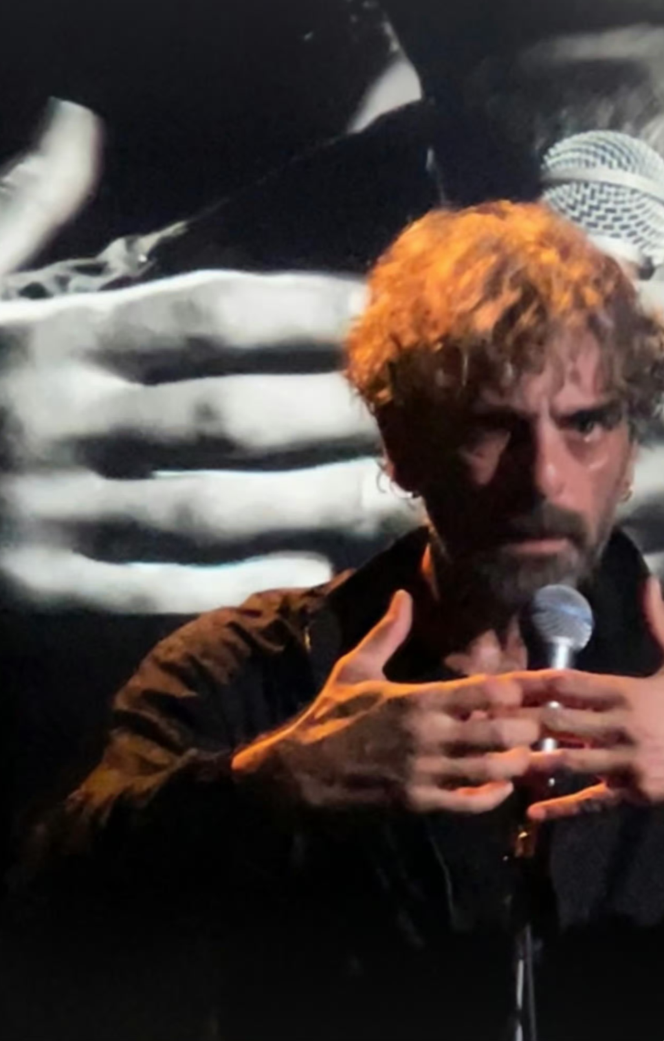 *第二场我坐在后排拍摄到的一瞬(和英国的戏剧观赏礼节不太一样,这个剧院是允许观众拍照的,我也是在第一晚结束后看到剧场官号转了不少现场观众拍的照片才知道,于是第二场就自己坐到后面几排去拍了)。如此岌岌可危的状态,持续了快两个钟头,也难怪会那样累,演出结束后在街上与我谈话时他连声音都是轻的。