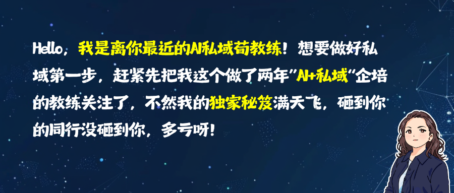 我是AI私域旬教练,腾讯官方认证私域增长师,AI私域增长咨询陪跑,找我!