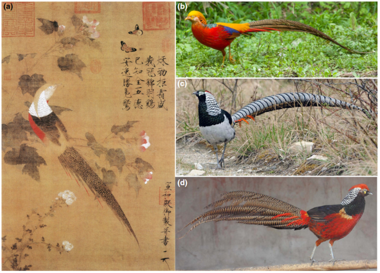 左图:宋代古画《芙蓉锦鸡图》右图:红腹锦鸡(b)、白腹锦鸡(c)、杂交个体(d)、(图片来源:Peng et al)
