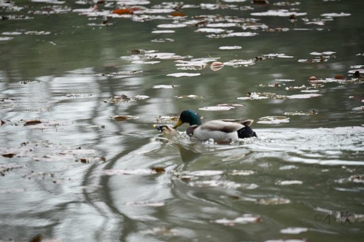 绿头鸭在斑嘴鸭的背上,衔住了斑嘴鸭的头颈部位,斑嘴鸭快速往前的同时上下扑腾,平静的水面泛起白浪,好像突然沸腾一样。随后,这片沸腾的气泡快速离我们远去。
