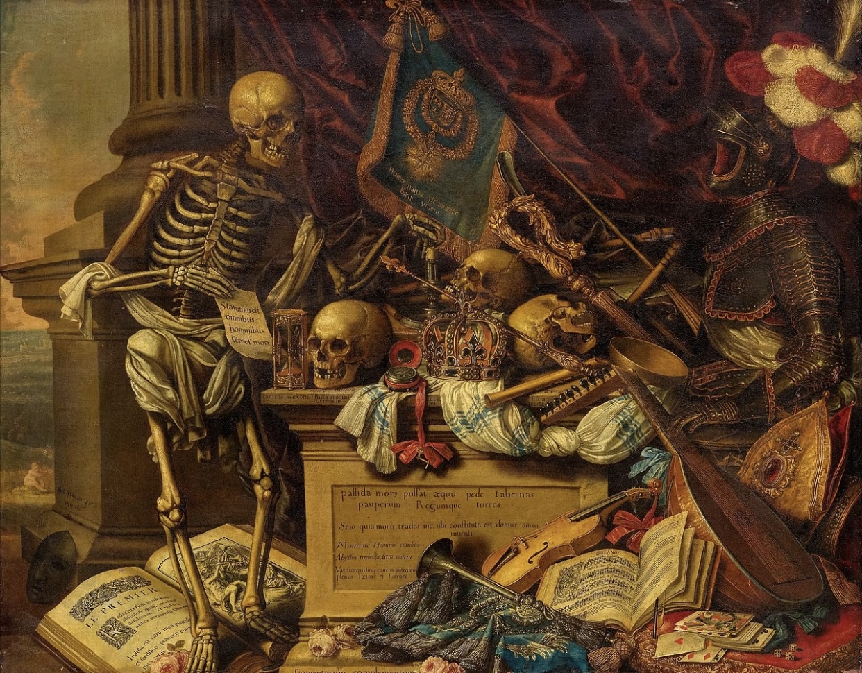 这幅作品 Memento Mori 是中世纪非常流行的一个艺术主题,翻译过来的意思是“记住你终将一死”。欧洲在经历黑死病之后,死亡成为日常生活中最直面的议题。"Memento mori"提醒人们生命的脆弱性和死亡的不可避免性。在这幅作品中,头骨和沙漏象征着死亡与时间,而一旁的盔甲、教皇冠、乐谱、纸牌、骰子等,则象征着财富、权势、娱乐、艺术等,在死亡面前一律平等。
