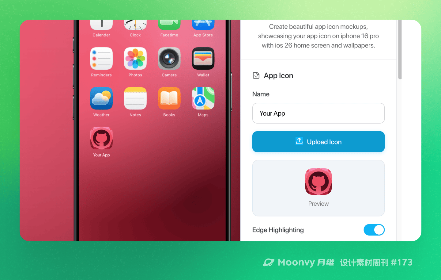 这是一个 iOS 26 应用图标的模板生成器,可以上传图片生成一个 iOS 26 应用图标在真实手机中的预览。