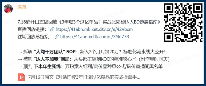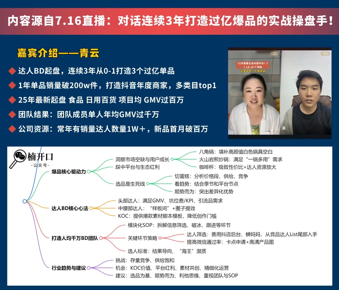 7月16日我们邀请了1位连续3年打造过亿爆品的实战操盘手-青云,做客我们楠开口的直播间,深度拆解了他的核心方法论,从爆品逻辑、达人筛选、团队管理到行业趋势,干货满满!