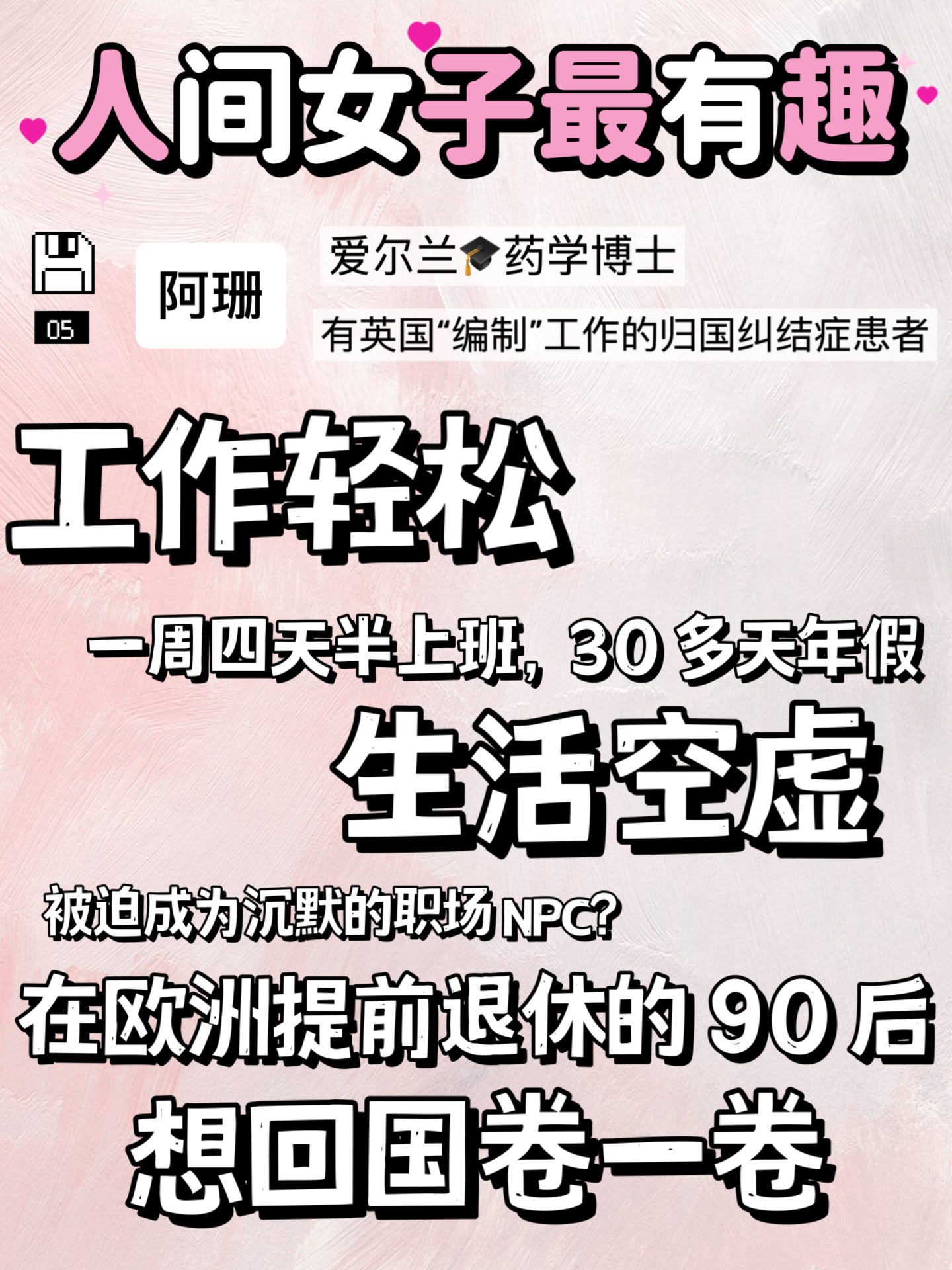 今天这位嘉宾是阿珊。在国外博士毕业后,她就顺利拿到了英国一家能给工签的永久职位,专业对口且轻松,一周上四天半班,三十多天年假,手机里没有任何工作相关 App,老板同事下班后从不发信息。 但她却经常觉得自己在熬日子非常想回国。 有人说她山猪吃不了细糠,回国自找苦吃。
