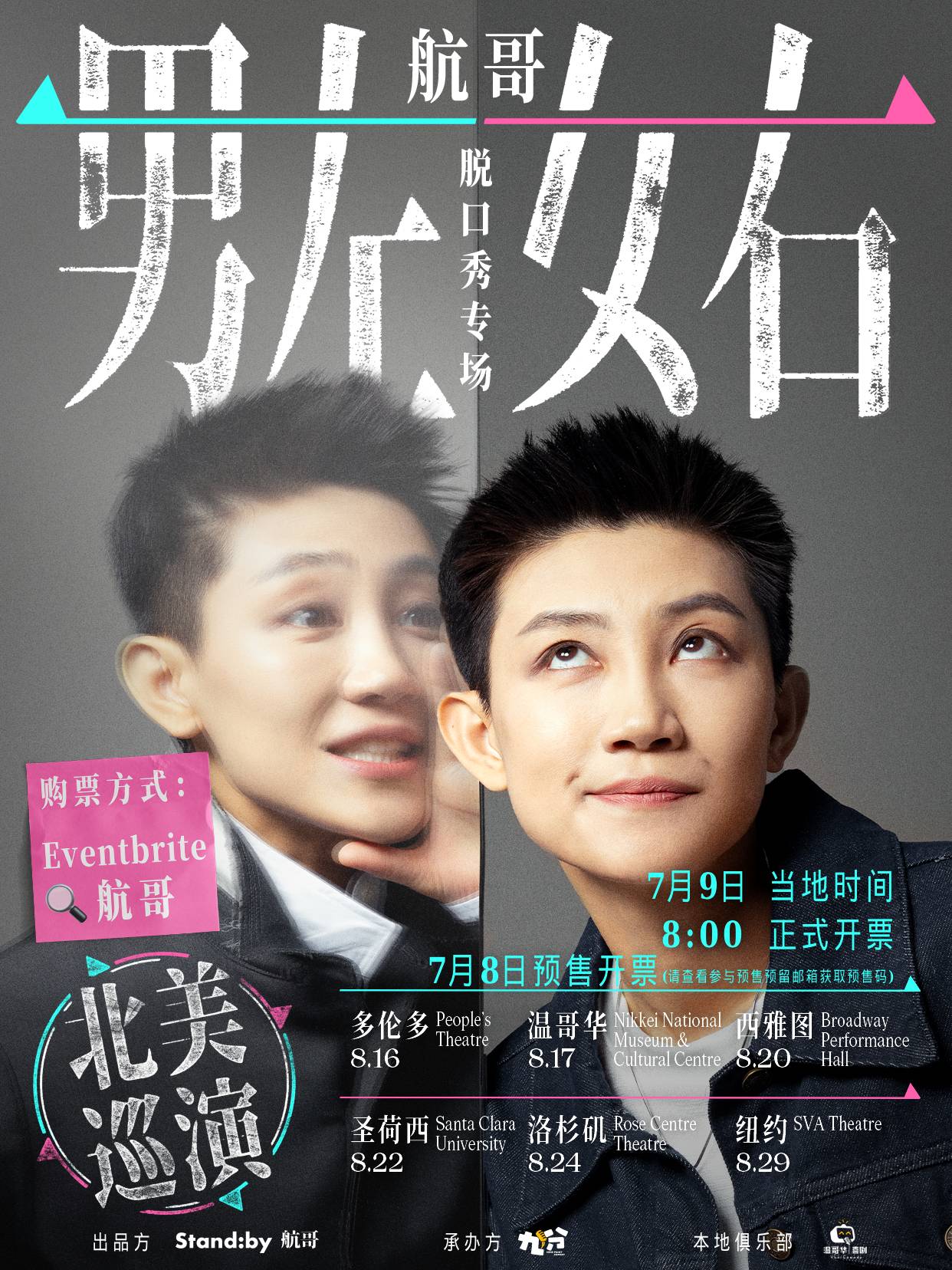 航哥北美巡演开票!Eventbrite平台搜索航哥即可购票!有任何疑问欢迎小红书联系@温哥华喜剧 或 @九分喜剧。或微信联系Vancomedy