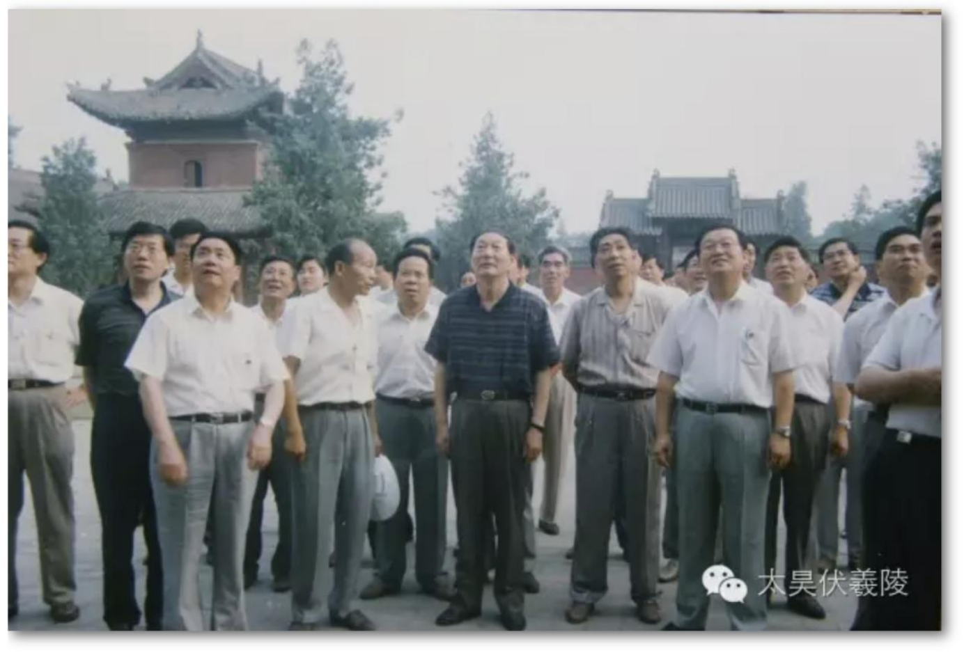 1997年6月26日,国务院副总理朱镕基同志对国家级重点文物保护单位、中华人文始祖太昊伏羲陵庙进行视察,时任博物馆副研究员的霍进善为其讲解(图片来源于公众号“太昊伏羲陵”)