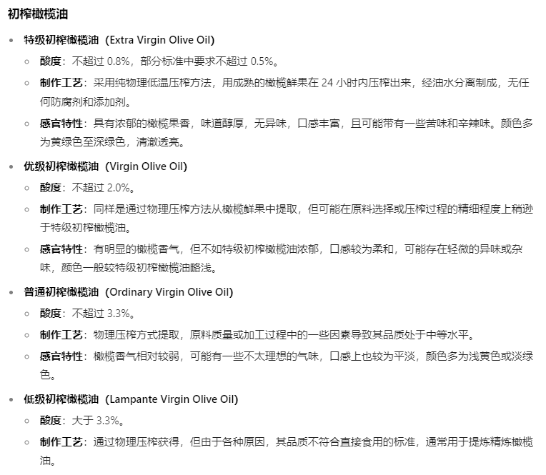 🔍 橄榄油分级(食用选酸度≤0.8%的特级初榨)
