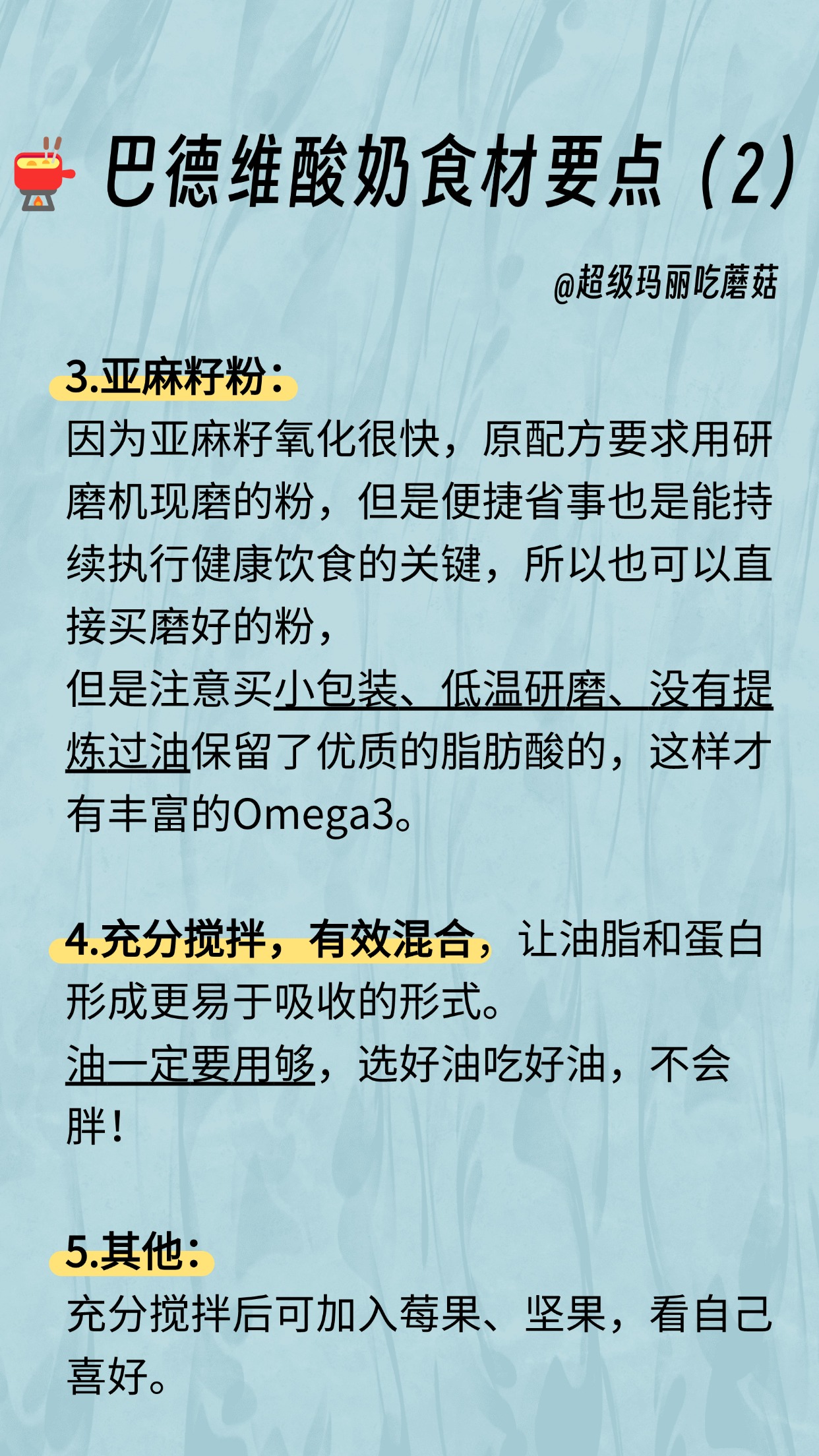 02:58 制作方法:亚麻籽油/紫苏籽油+夸克/茅屋奶酪/希腊酸奶+亚麻籽粉,充分搅拌
