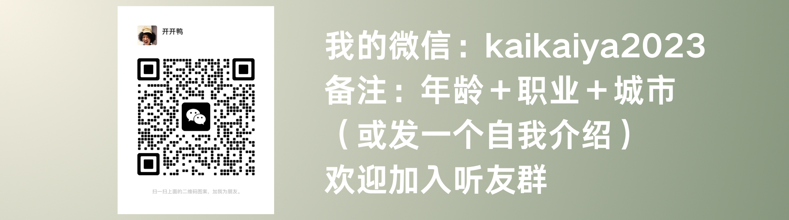 欢迎各位优秀的00后或者想了解00后,想跟我们一起交流的朋友进群!欢迎添加微信号:kaikaiya2023(我的wx),记得备注你的昵称+年龄+职业哦!如果可以给我发一个简短的自我介绍,那就更棒了。