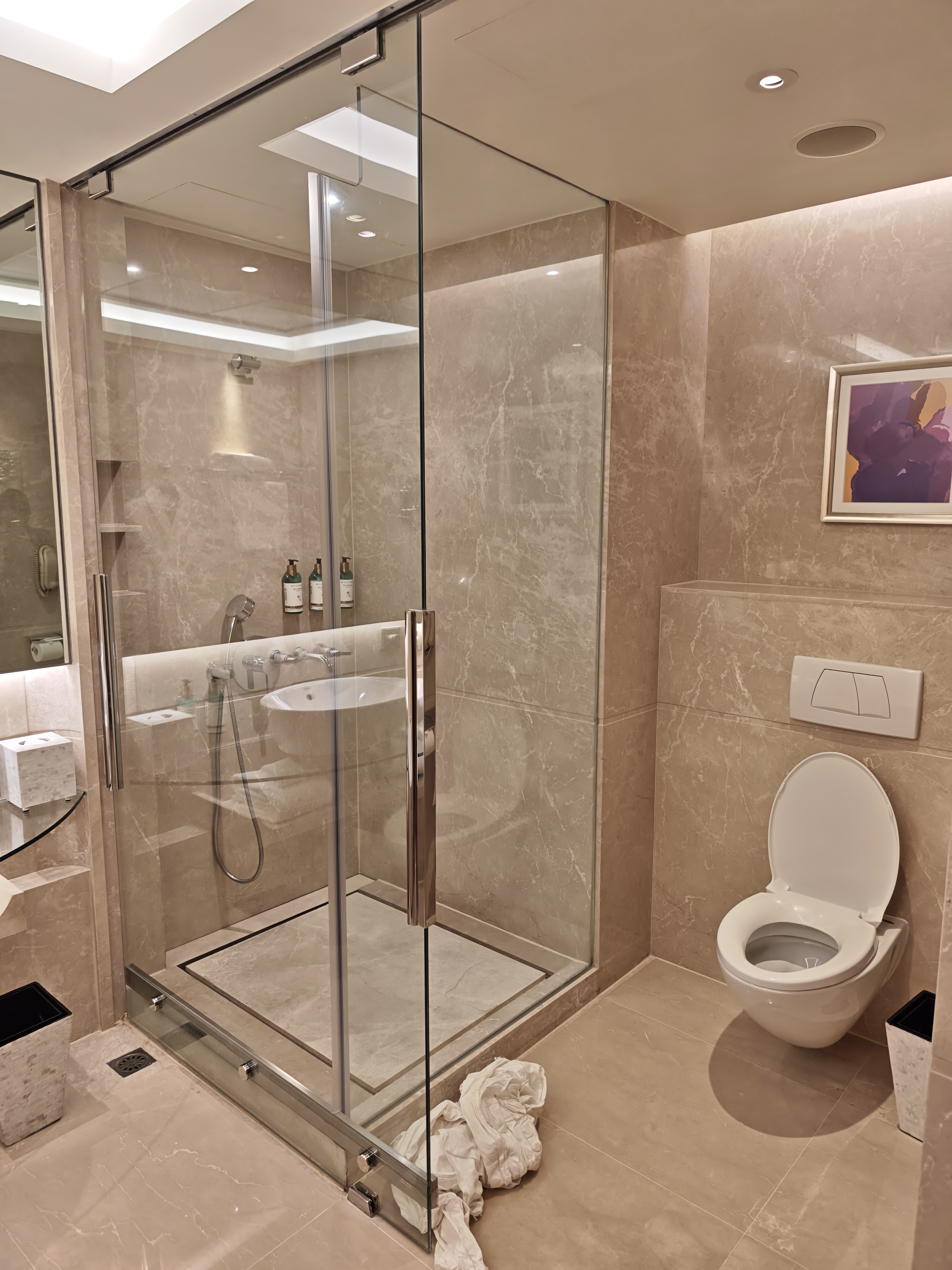 淋浴间的“水舞间”:洗澡时惊喜发现,淋浴门不仅防人,还...防不住水?地面自动上演“涓涓细流”,免费附赠“湿脚体验”。嗯...这算是酒店特色“水疗”的一部分吗?(温馨提示:防滑拖鞋是刚需!)