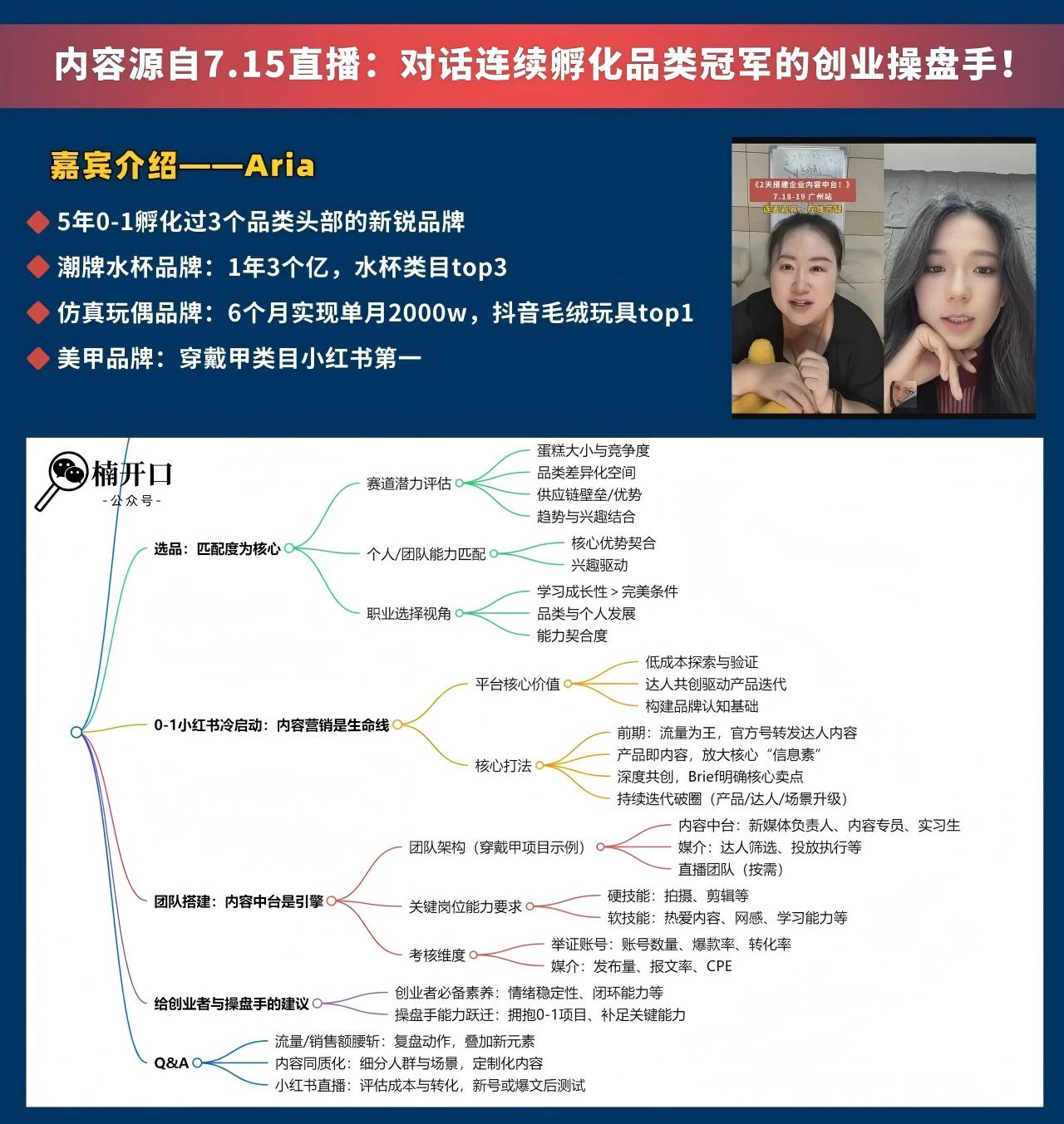 7月15日我们邀请了1位5年0-1孵化出3个品类冠军的操盘手-Aria,做客我们楠开口的直播间,分享了她的创业经验,涵盖选品策略、0-1起盘心法、内容营销核心、团队搭建及创业者必备素养,助你少走弯路!
