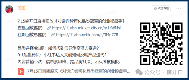 ➡如果你也想被更多人看到,获得建联合作的机会,欢迎来直播间做客!【关注楠开口公众号添加汤圆微信】
