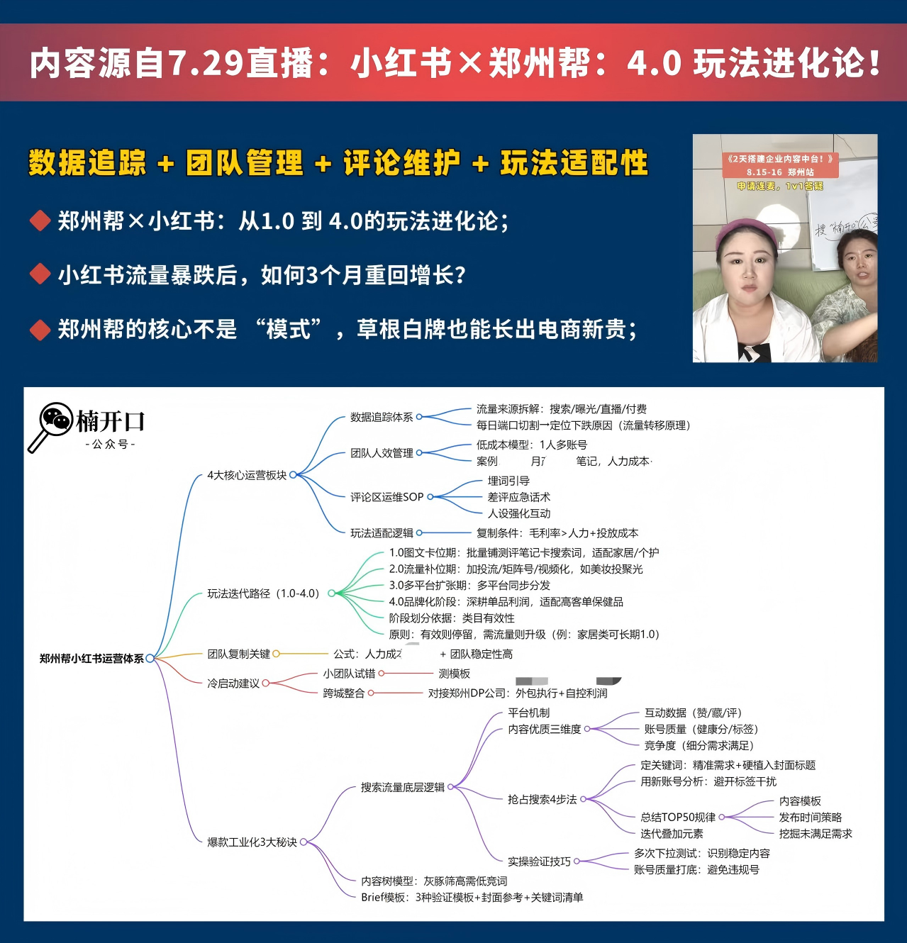 郑州玩法(小红书)从 1.0 到 4.0 的迭代,本质是一套 “在变化中找确定性” 的生存逻辑 —— 从依赖流量红利的粗放式扩张,到通过数据驱动、标准化流程、风险预判实现精细化运营。