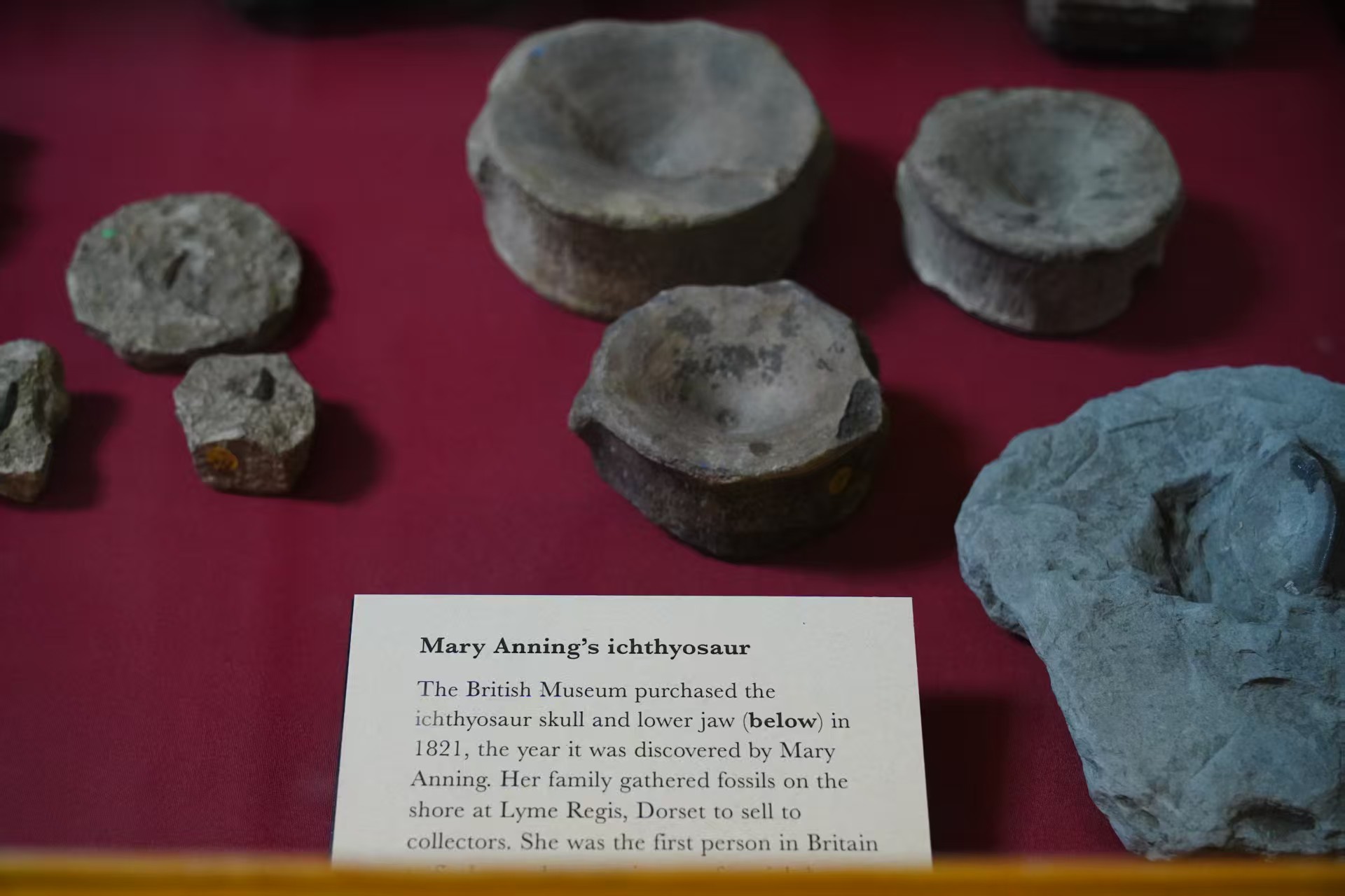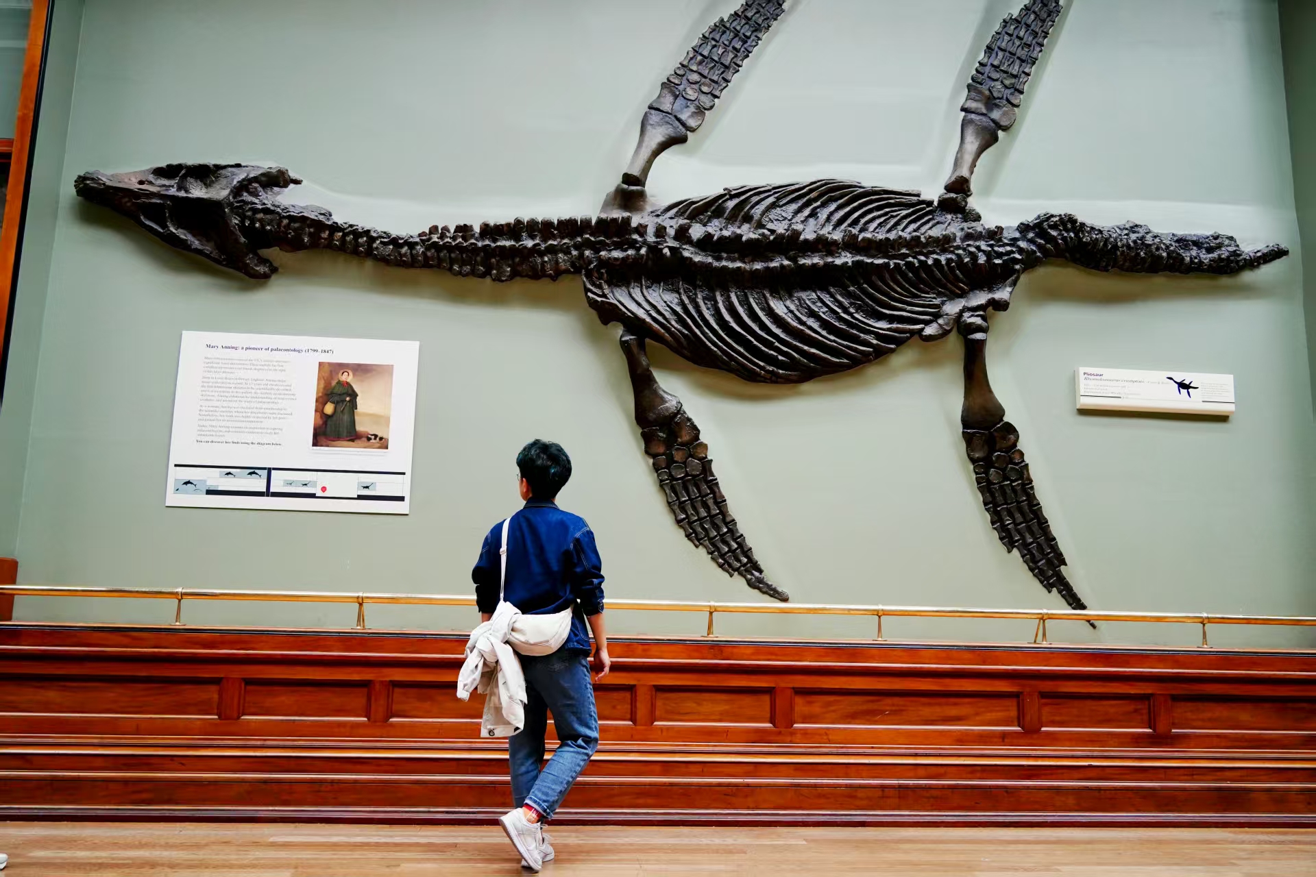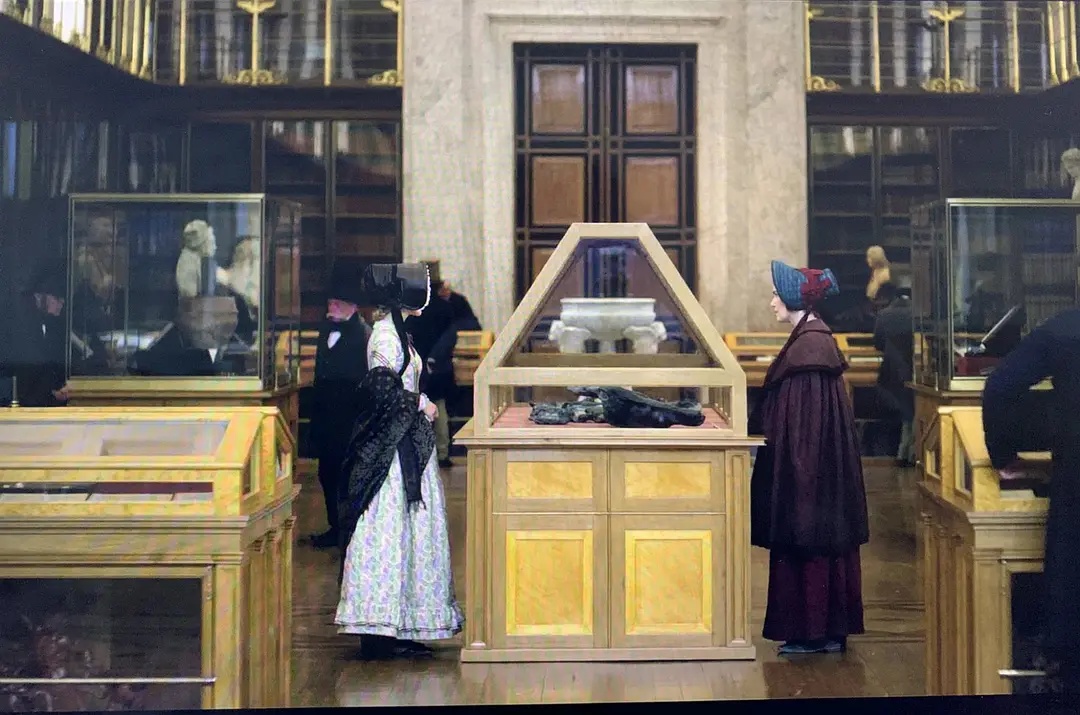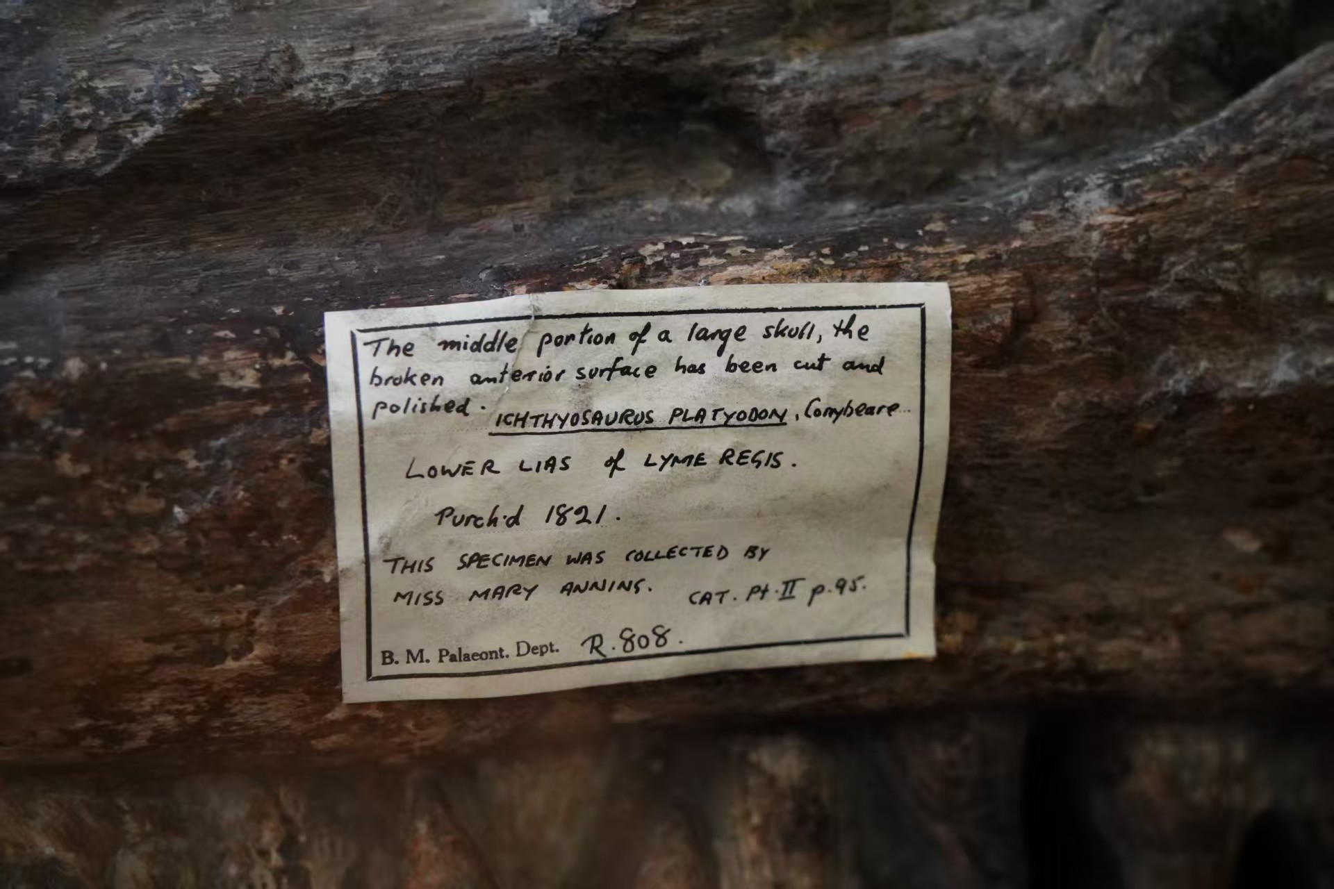 电影最后,Mary第一次来到伦敦大英博物馆,看着展柜中自己发掘的鱼龙化石。