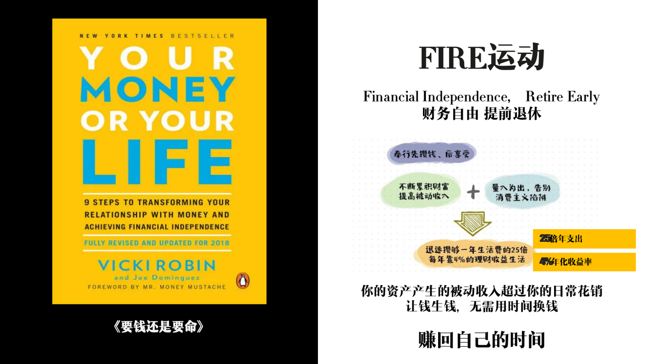- 提出“FIRE运动” (Financial Independence, Retire Early)(财务独立,提前退休)的概念,通过储蓄和投资,提前退休或减少对工作的依赖。